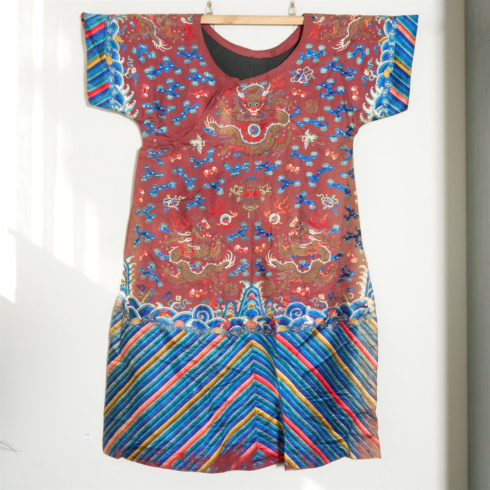 A CHINESE QING SILK EMBROIDERED ROBE, 19TH CENTURY (wear to embroidery in areas) L.141CM