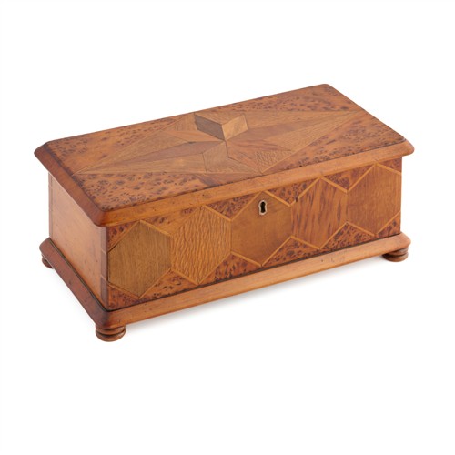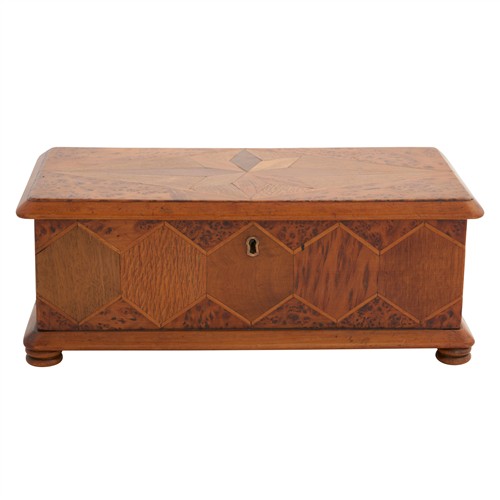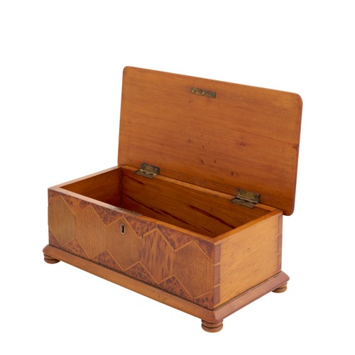 Rectangular with a hinged top with bevelled edges and moulded base on turned feet, the top and front geometrically-veneered in various New Zealand woods including burr totara, puriri, mottled kauri, rewa rewa, kohekohe, maire and others, the carcase kauri, the underside with a pencil diagram indicating the woods used