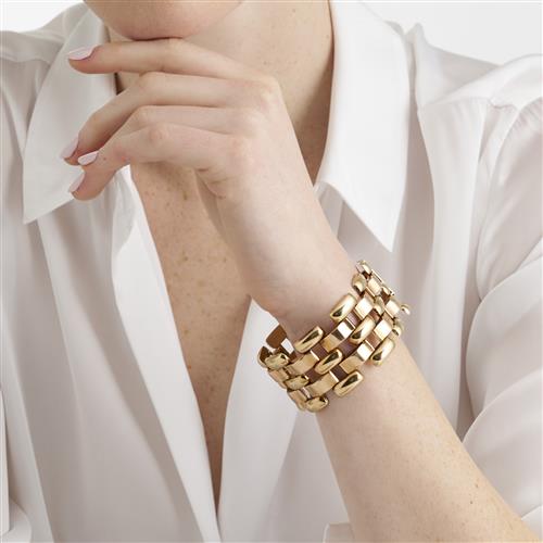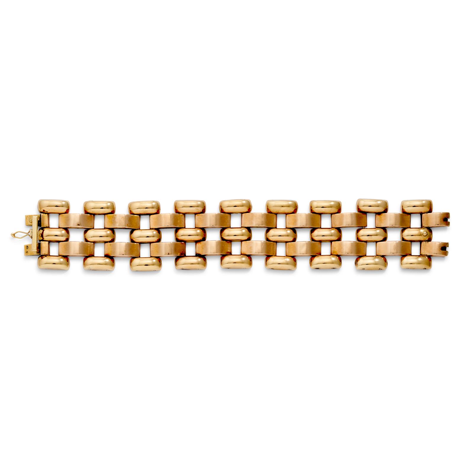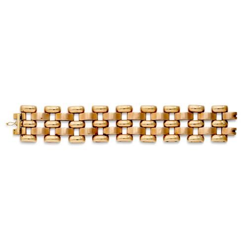 Of open work geometric design centring a twin line of pink gold interlocking arched tank track links between three rows of high half round links, width 35mm, length 200mm, gross weight 42.8 grams, indistinct Austro-Hungarian makers marks.
