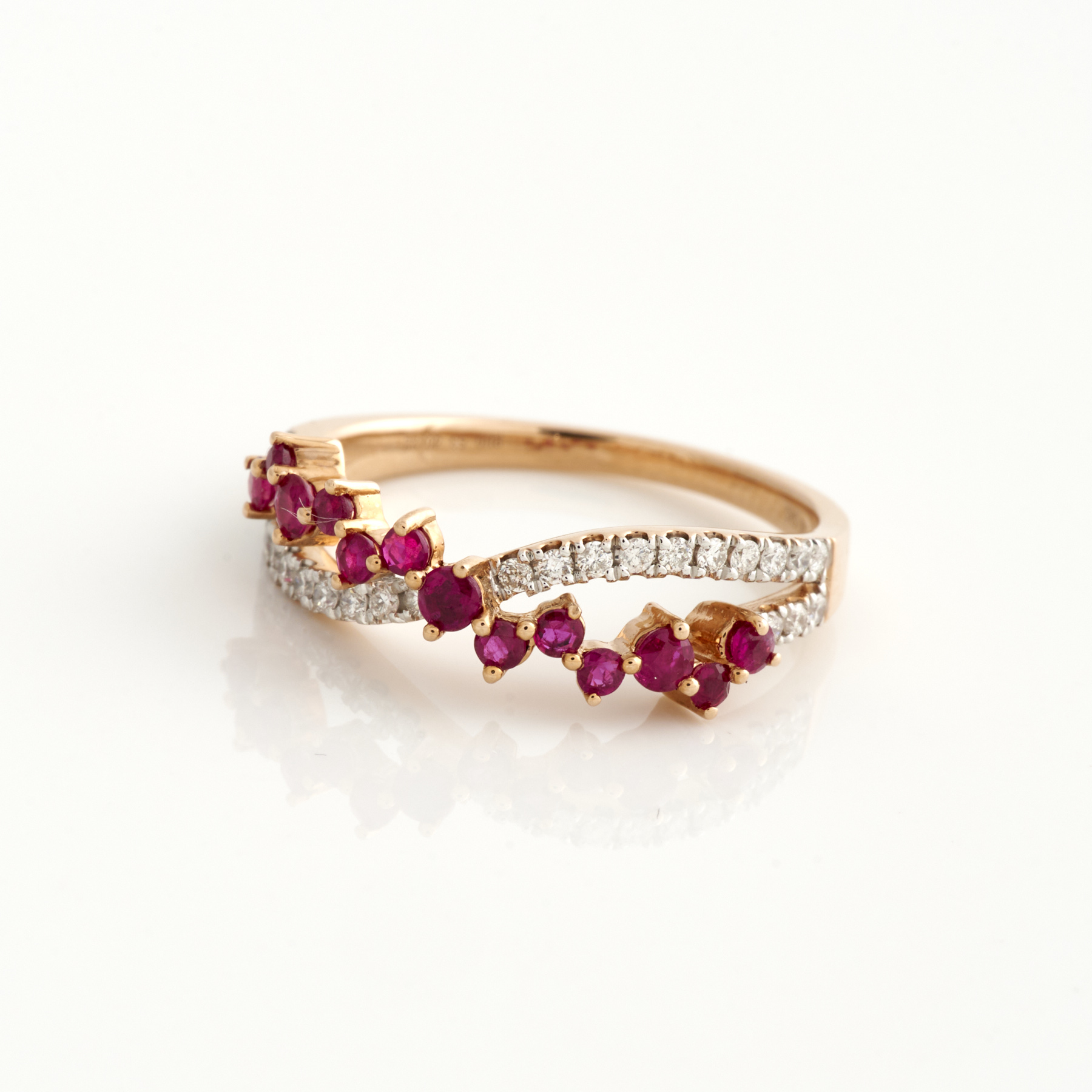 A RUBY AND DIAMOND RING IN 14CT ROSE GOLD, THE RUBIES TOTALLING APPROXIMATELY 0.53CTS, THE DIAMONDS TOTALLING APPROXIMATELY 0.22CTS, SIZE O, 2.7GMS