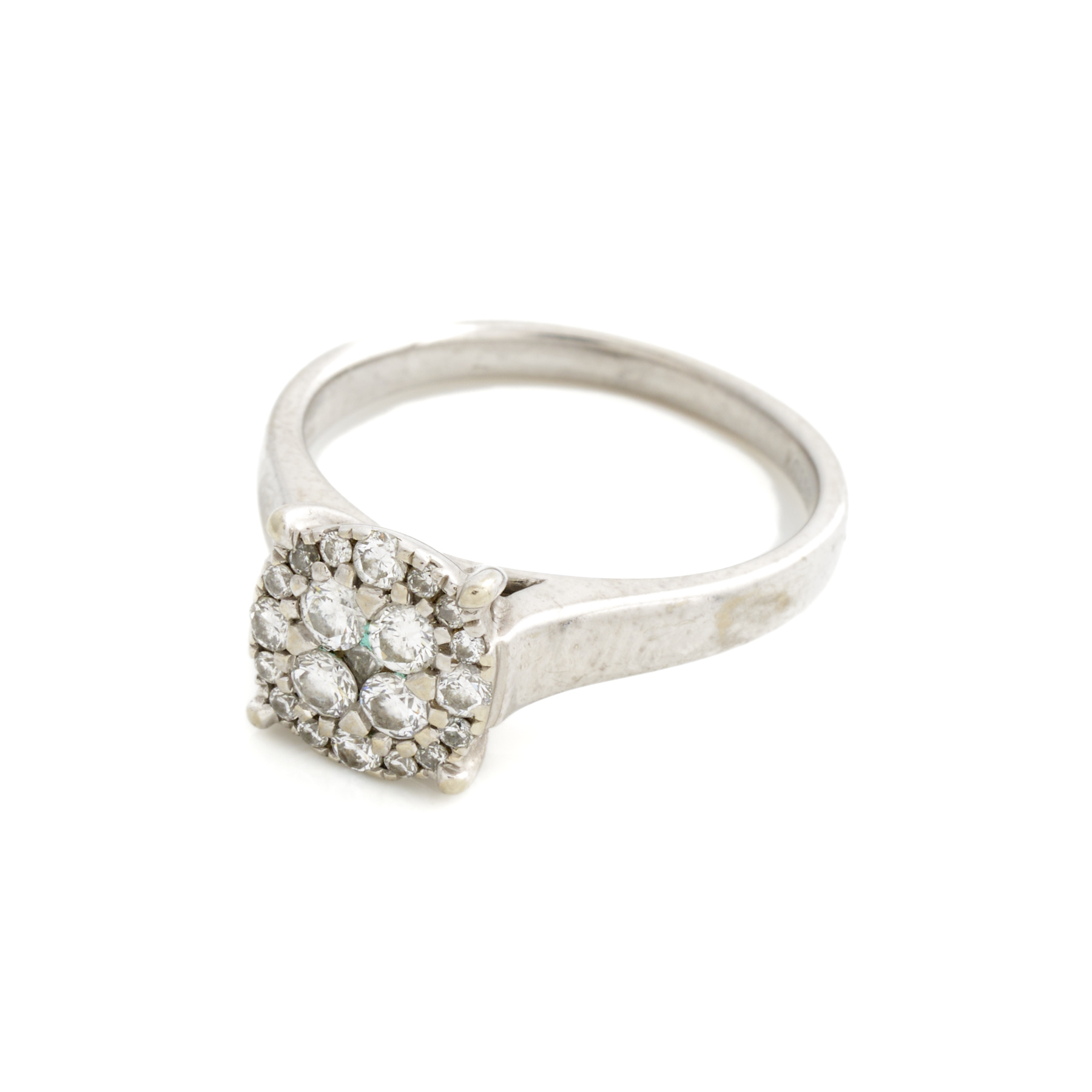A DIAMOND CLUSTER RING IN 10CT WHITE GOLD, THE DIAMONDS TOTALLING APPROXIMATELY 0.51CTS, SIZE O, 3.6GMS