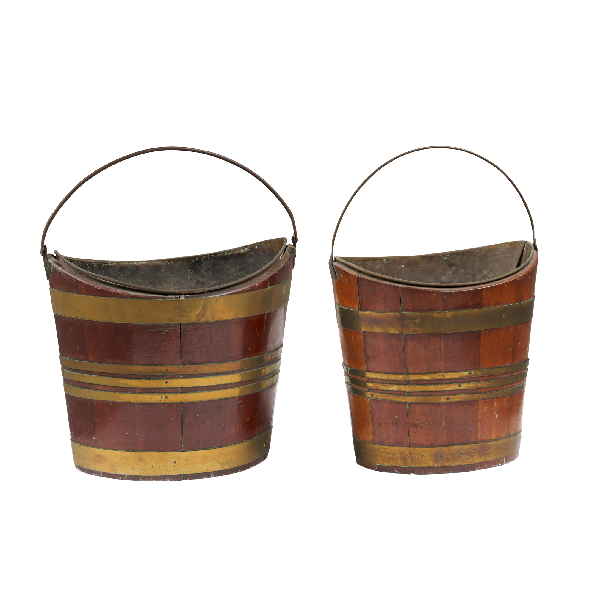Each of elliptical outline, one with pointed ends, with a swing handle mounted to the raised ends of the rim, bound with brass bands, with (distressed) brass liners