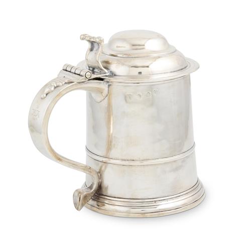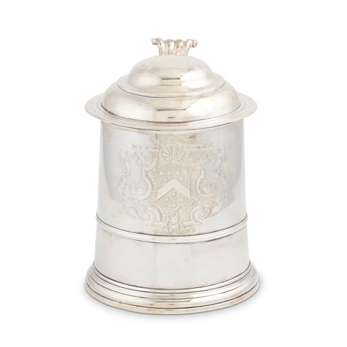 The spreading cylindrical girdled body on a moulded foot with a domed cover, the scrolling handled with a scroll thumbpiece, baluster drop and shaped terminal, the body engraved with a coat of arms, the handle engraved with initials * M A *