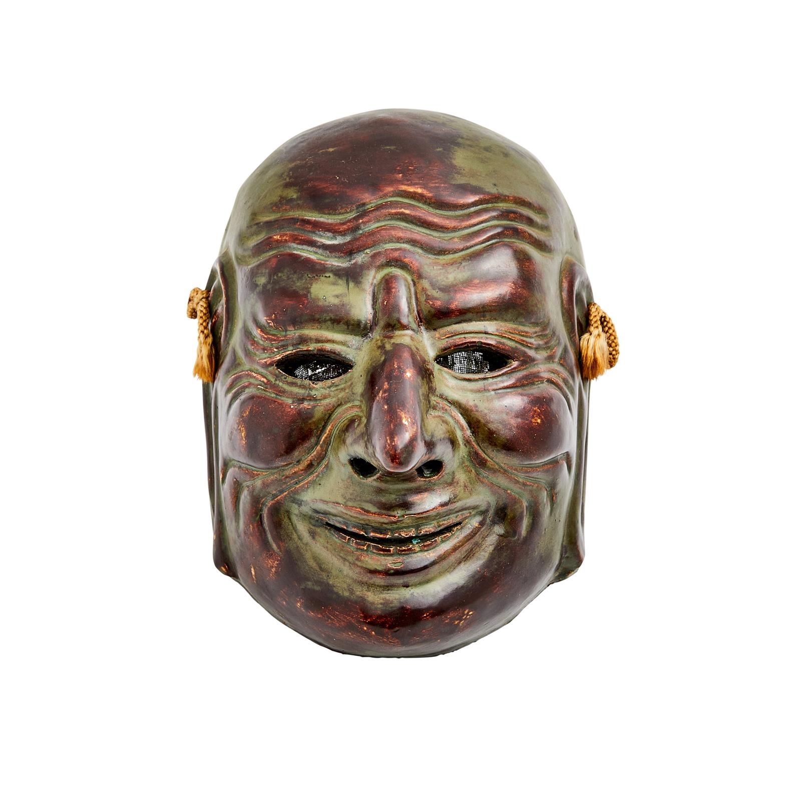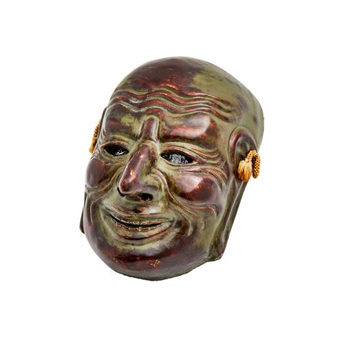 Depicting an elderly man in the traditional Gigaku manner, constructed from painted plaster with netted cloth lining.