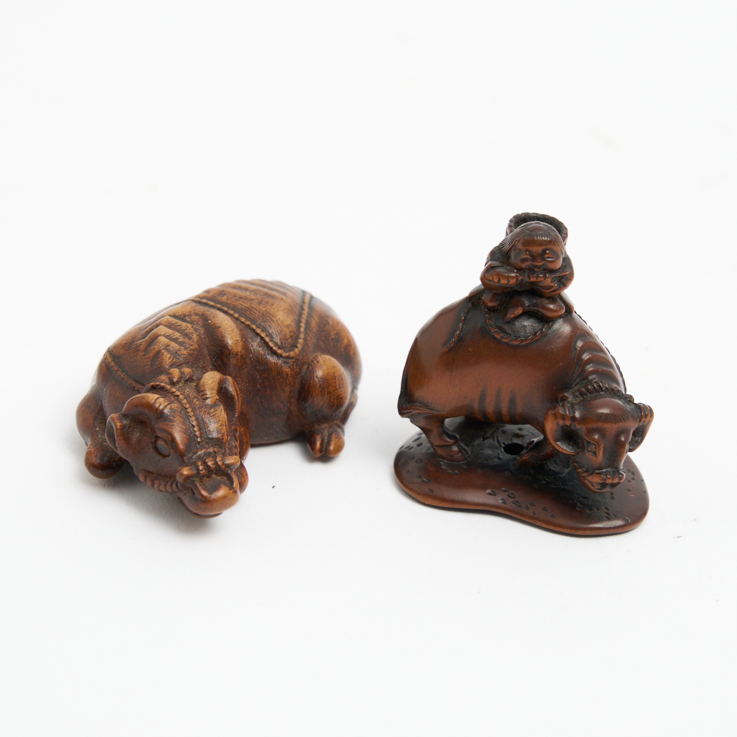 TWO JAPANESE NETSUKE, SPURIOUS SIGNED TOMOTADA: A RECUMBANT OX AND BOY ATOP AN OX L.5CM (LONGEST)