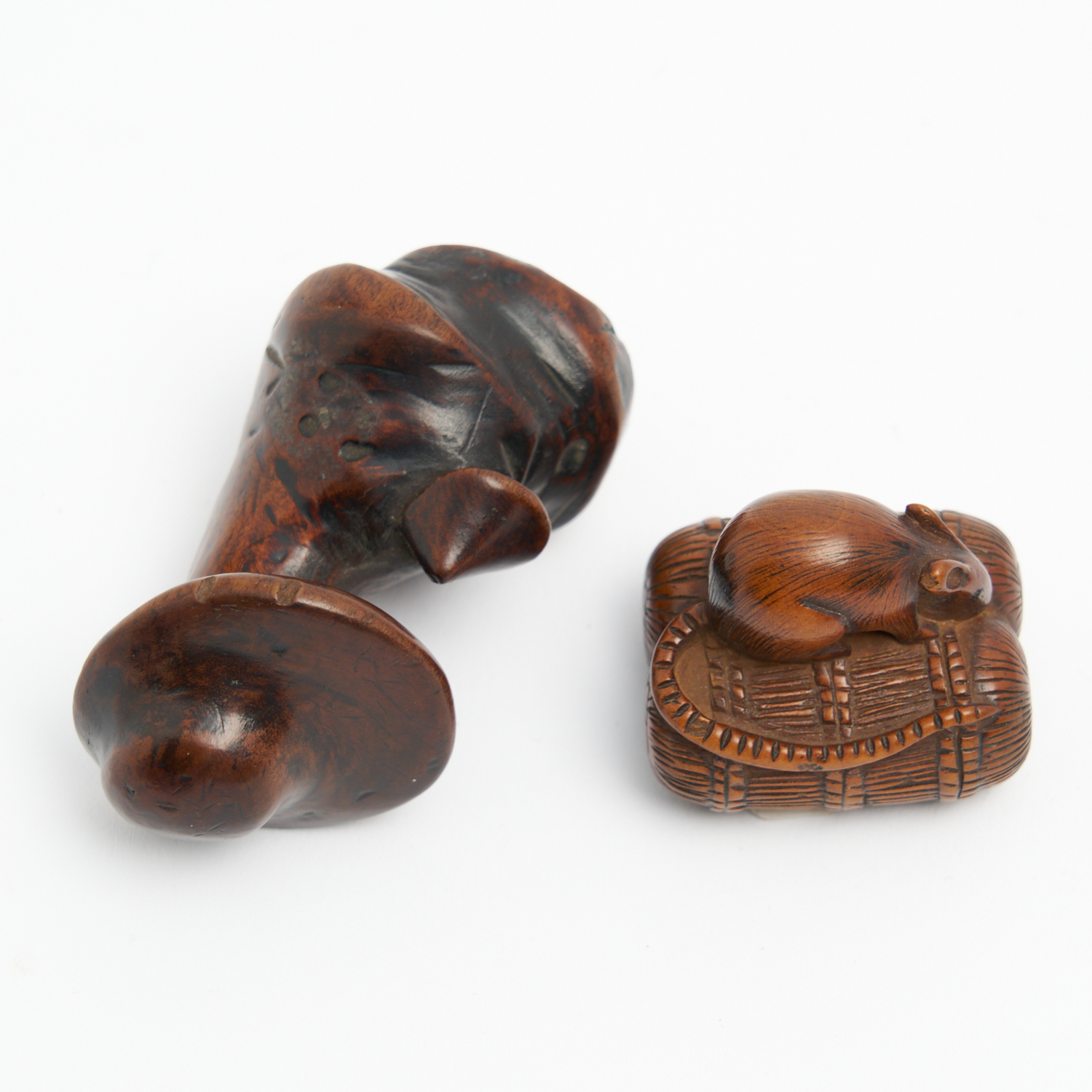 TWO JAPANESE NETSUKE: MUSHROOM AND MOUSE ATOP TWO BARRELS L.6CM (LARGEST)