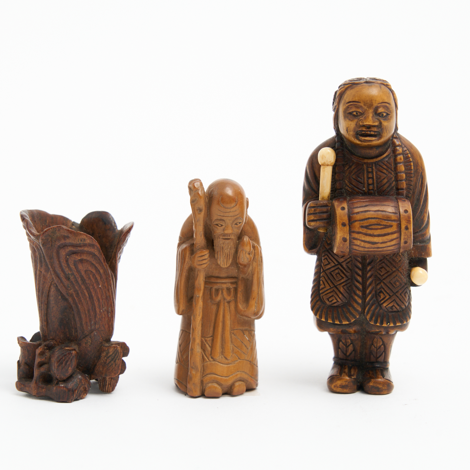 TWO JAPANESE NETSUKE OF A DRUMMER AND A BLOOMING FLOWER TOGETHER WITH A SMALL CARVED FIGURE OF SHAO LAO H.8CM (TALLEST)