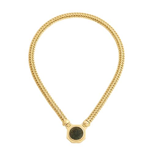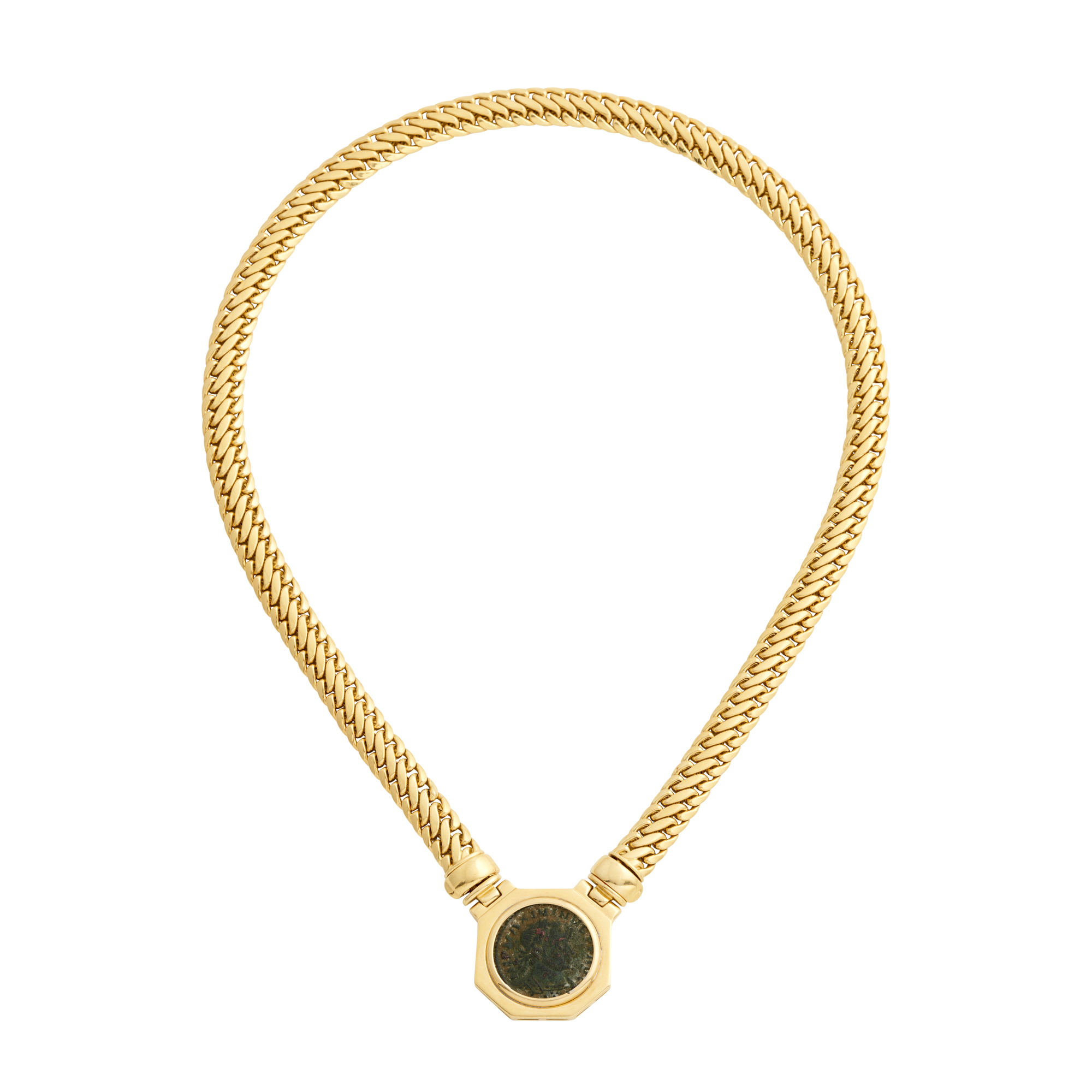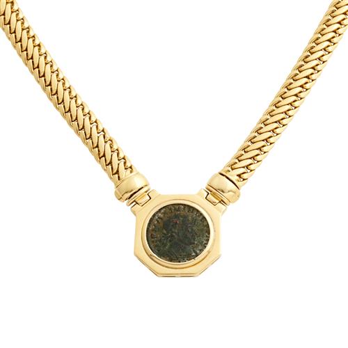 Centring an ancient bronze Roman coin within an octagonal gold border, to an integral fancy link chain completed by a concealed clasp, Italian marks, length 485mm, gross weight approximately 46.3 grams.