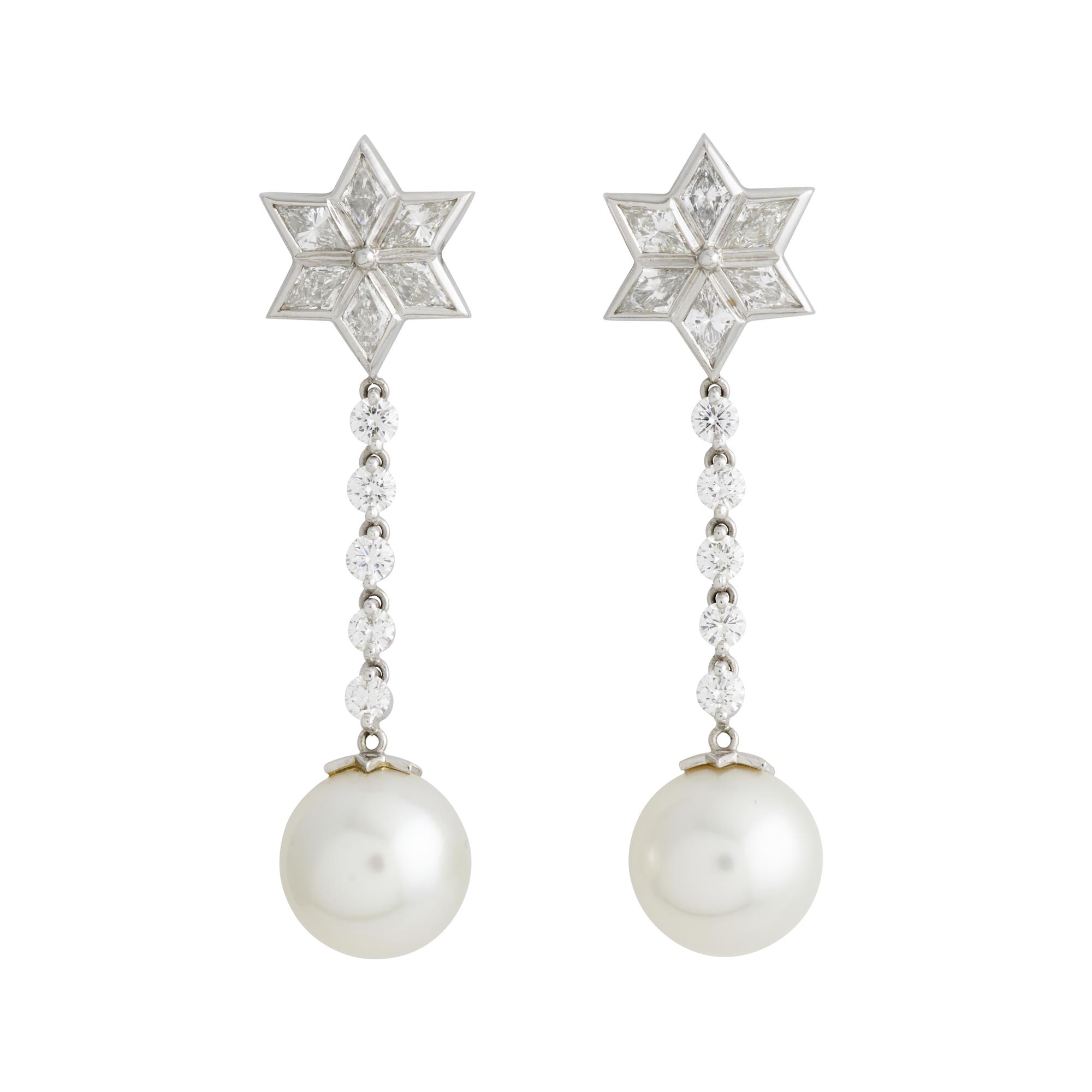 Featuring a pair of round South Sea Pearls suspended from a line of articulated bezel set round brilliant cut diamonds attached to a bezel set six-pointed diamond star each set with lozenge-shaped diamonds, the diamonds together weighing approximately 2.30 carats, length 53mm, gross weight approximately 15.4 grams