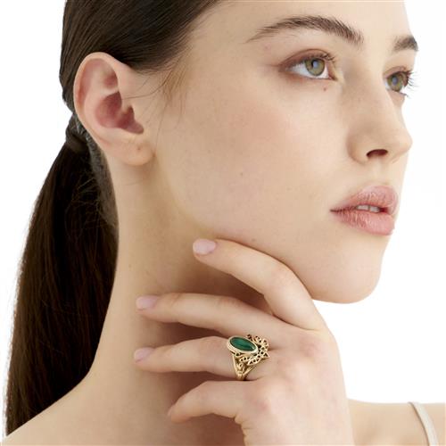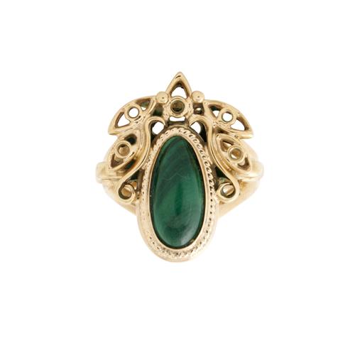 Featuring an oval malachite cut en cabochon within a partial foliate surround, size N, gross weight approximately 8.5 grams.