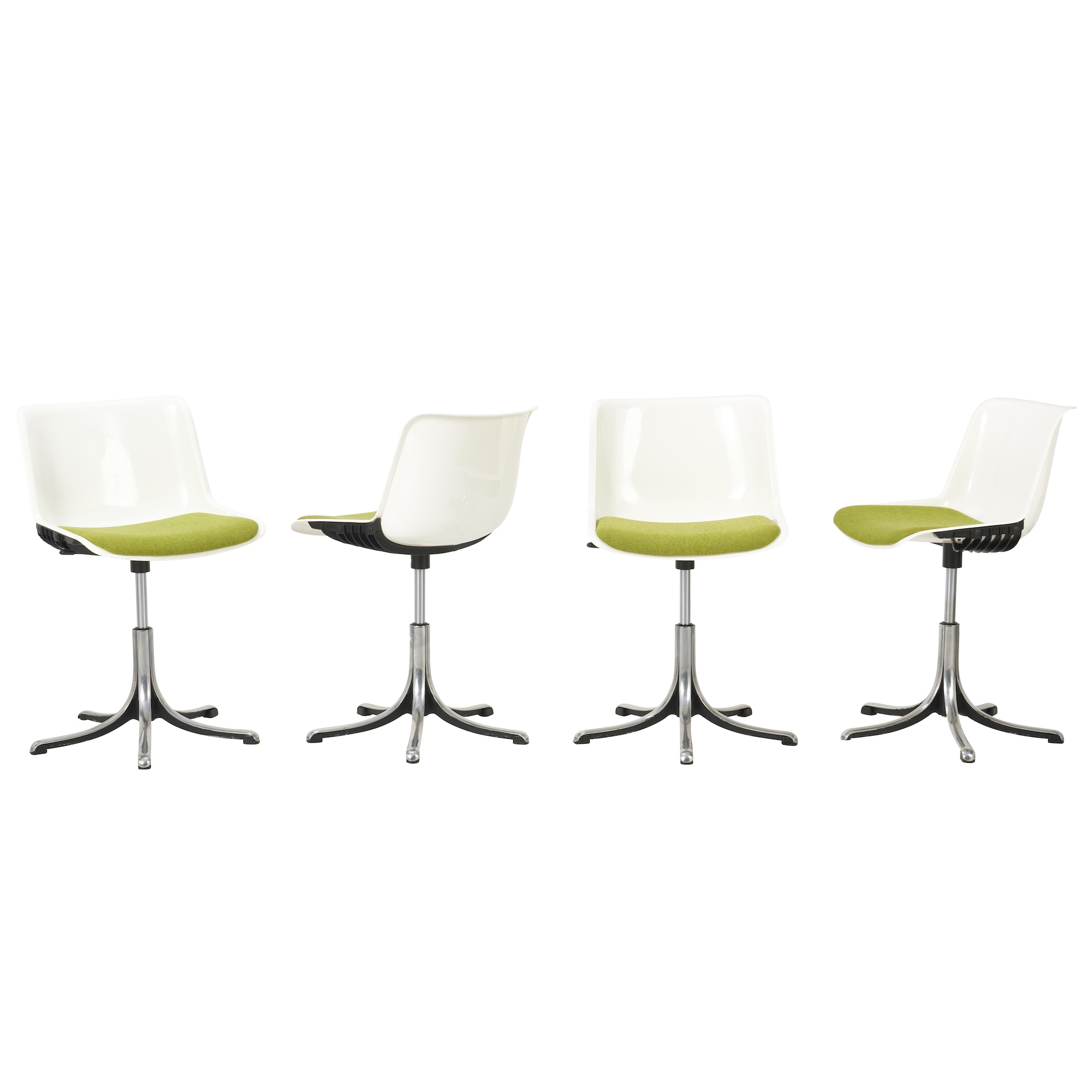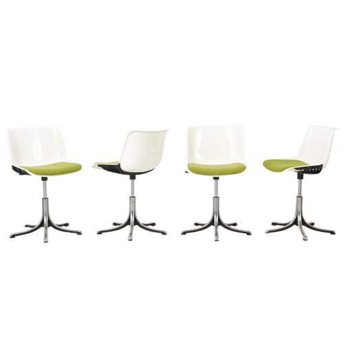White plastic shells with green wool textile seats on aluminium bases.