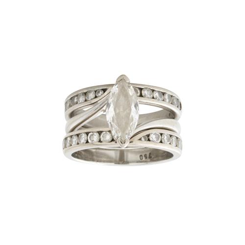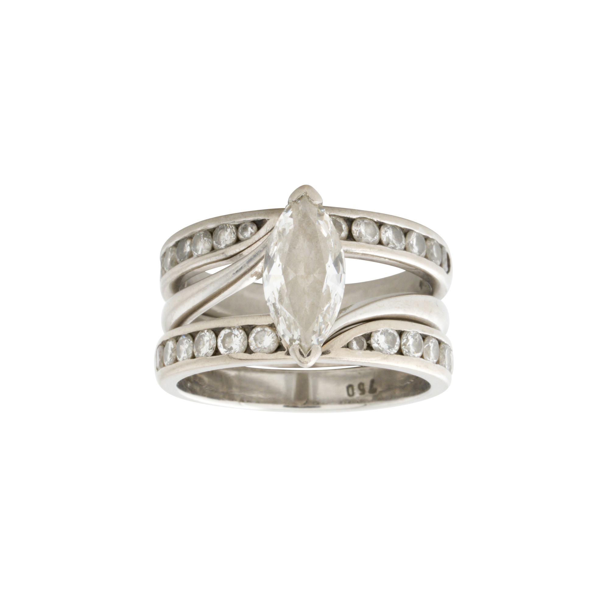 Featuring an end-set marquise-cut diamond weighing approximately 1.00 carat, flanked by two fitted bands, each channel-set with round brilliant-cut diamonds together weighing approximately 0.90 carats, size M, gross weight approximately 10.3 grams.