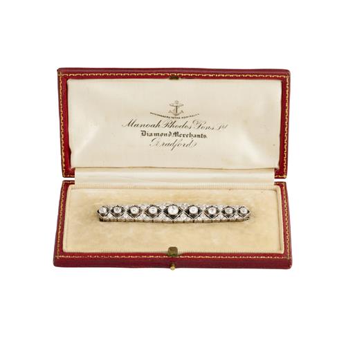 Comprising nine graduated milgrain bezel-set old European-cut diamonds each within a surround of onyx and further decorated with trefoils of claw-set old European-cut diamonds, the diamonds together weighing approximately 2.20 carats, length 74mm, gross weight approximately 10.5 grams.