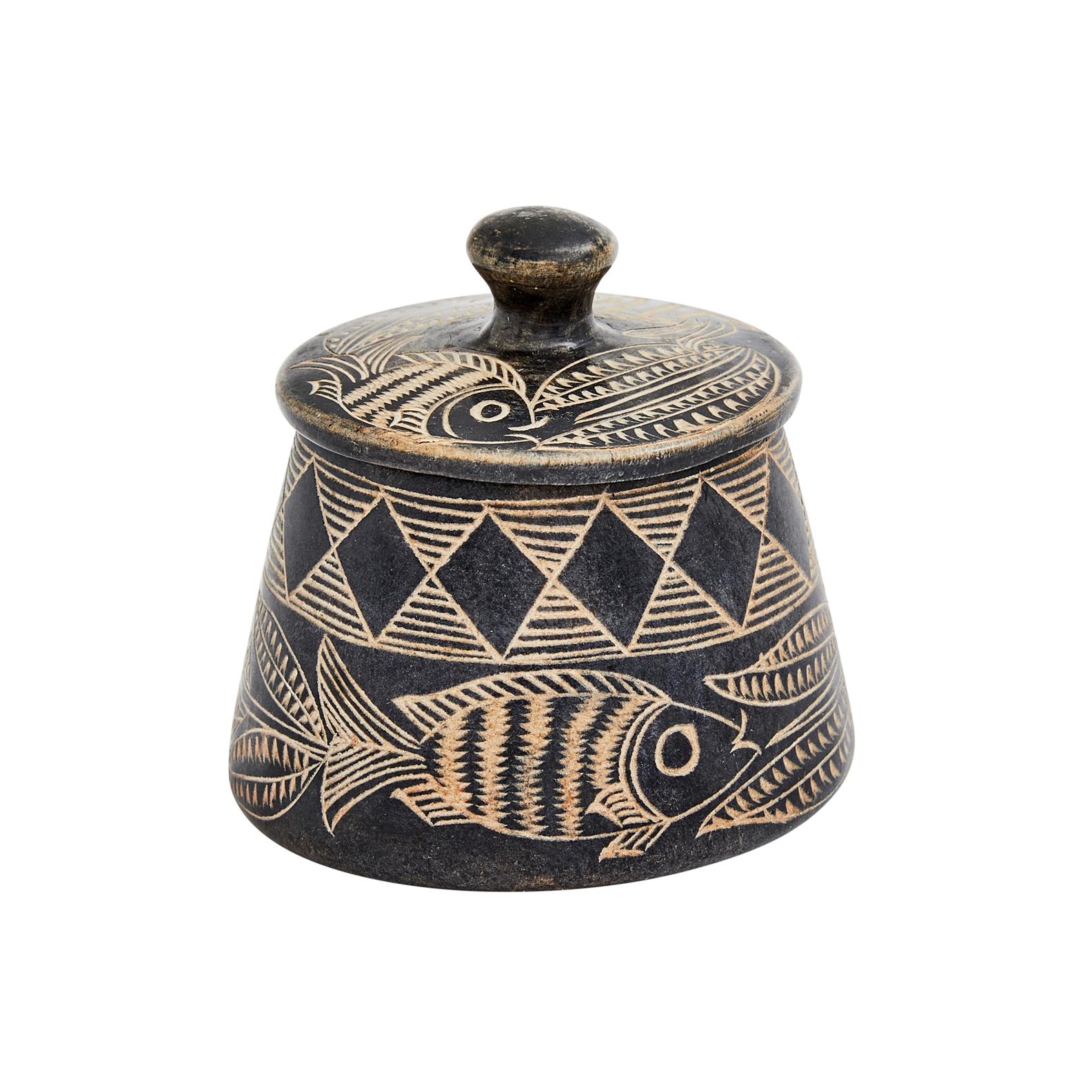 The circular lid with finial and incised with fish and foliage, the conical body incised with a geometric border to the top and a band of fish and foliage below (unsigned).