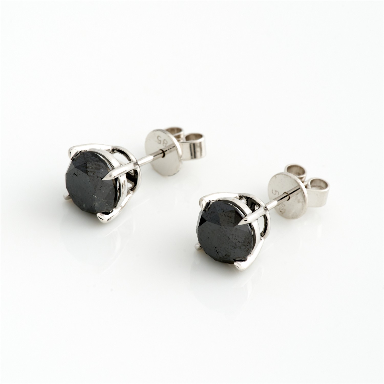 A PAIR OF BLACK DIAMOND EARRINGS IN 14CT WHITE GOLD, THE DIAMONDS TOTALLING 4.14CTS, TO POST AND BUTTERFLY FITTINGS, 3.4GMS