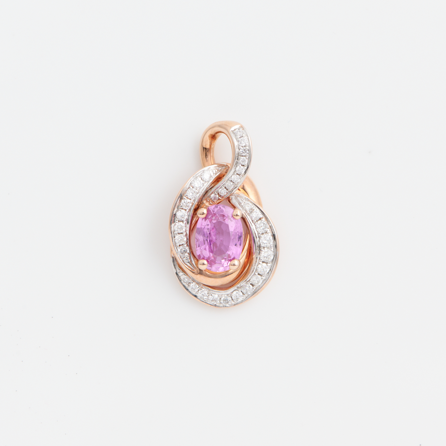 A PINK SAPPHIRE AND DIAMOND PENDANT IN 14CT ROSE GOLD, THE SAPPHIRE WEIGHING APPROXIMATELY 0.90CTS, THE DIAMONDS TOTALLING APPROXIMATELY 0.18CTS, 22MM, 2.8GMS