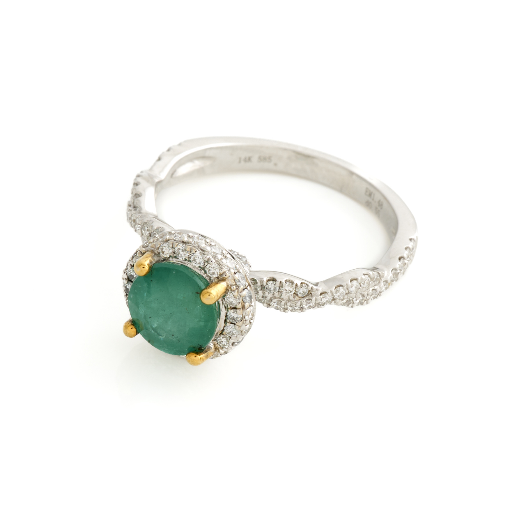 AN EMERALD AND DIAMOND RING IN 14CT WHITE GOLD, THE EMERALD WEIGHING APPROXIMATELY 1.48CTS, THE DIAMONDS TOTALLING APPROXIMATELY 0.55CTS, SIZE O, 3.8GMS