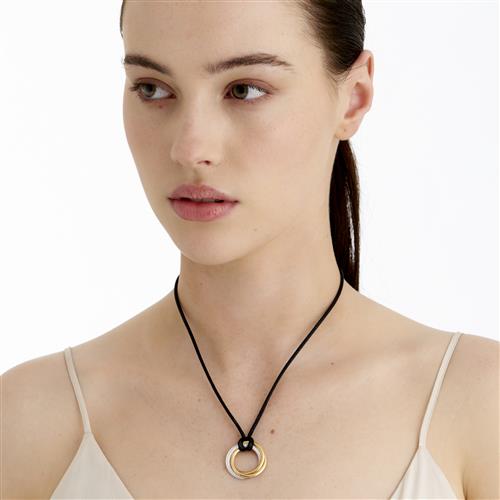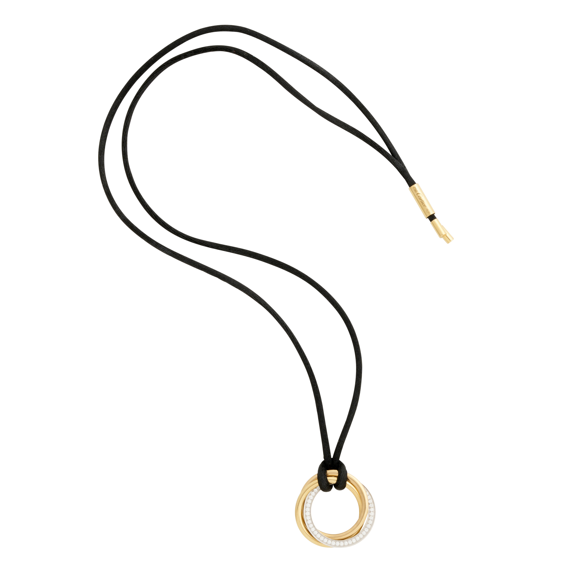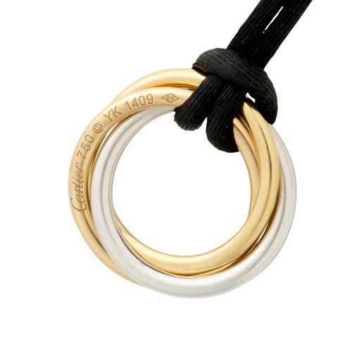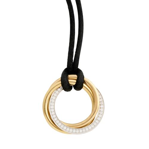 Composed of three interlocking rings, one pavé-set with round brilliant-cut diamonds together weighing approximately 0.35 carats, suspended from an adjustable black silk cord with gold terminals, signed Cartier, numbered YK1409, pendant diameter 30mm, length 600m adjustable, gross weight approximately 13.2 grams.
