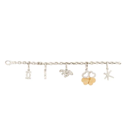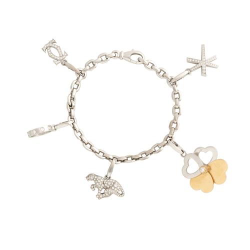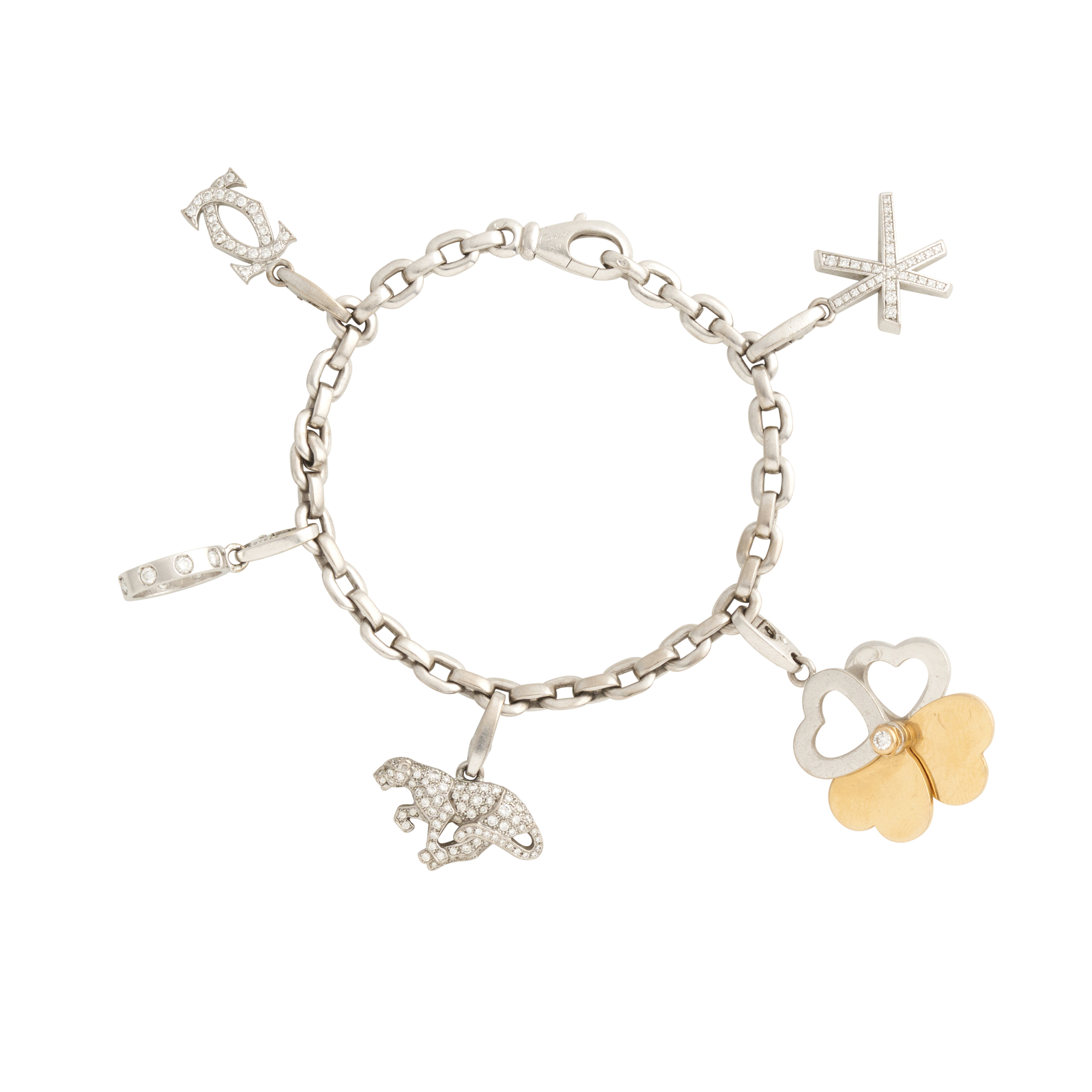 Modelled as a cable link chain suspending five detachable diamond-set charms, completed by a parrot clasp, bracelet and individual charms signed Cartier, bracelet numbered 976328, length 180mm, gross weight approximately 39.9 grams.