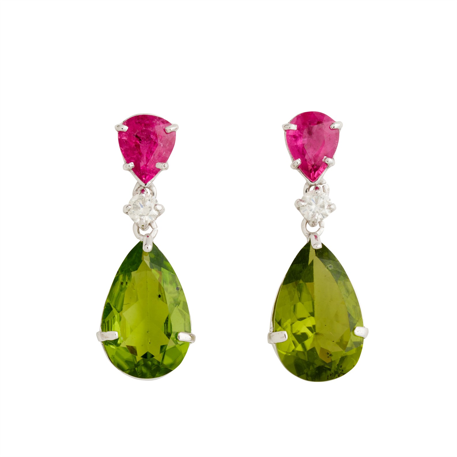 In our opinion, the peridot is of slightly yellow green with moderate saturation, some typical inclusions, some minor abrasions to the facets and facet junctions. Tourmalines of good commercial quality. The diamonds are bright and lively, probably of H to I colour and SI clarity, as gauged and graded within the limitations of the cutting style and the mounting. The mounting displays minor scratches, commensurate with age and wear.