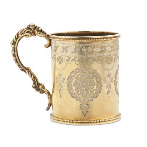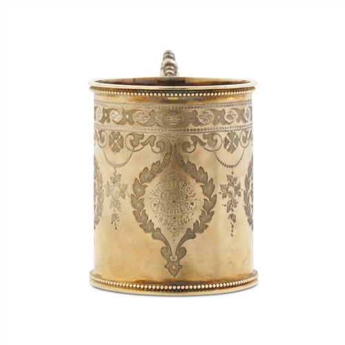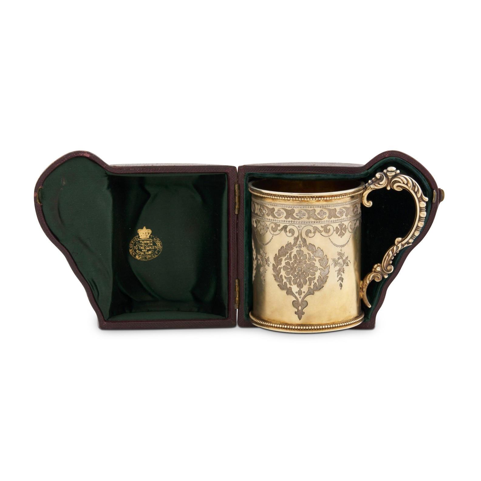 Cylindrical with a beaded lip and foot and scrolling handle, the body engraved with stylised floral foliate designs contrasting with the matte gilt ground, the interior gilt, the central foliate cartouche engraved 'TO / VICTORIA ROSS / from / Victoria R / 9 Decr. 1867', fitted in the original leather-covered case with retailer's mark for J. Turner, Jeweller to the Queen and Royal Family, 58 & 59 New Bond Street, London