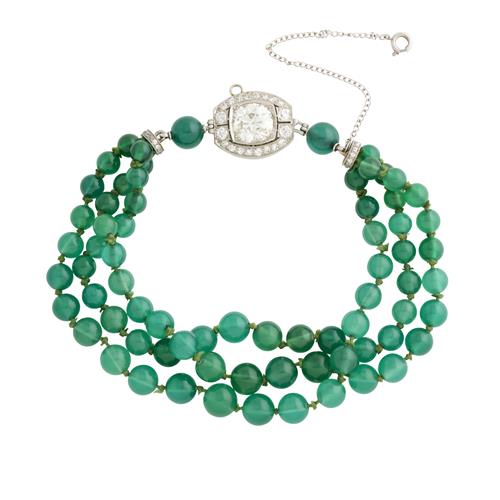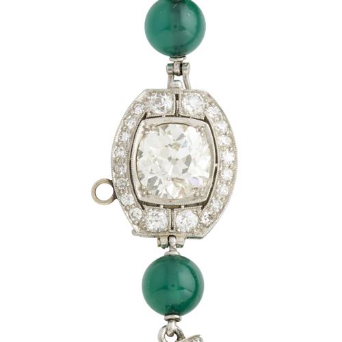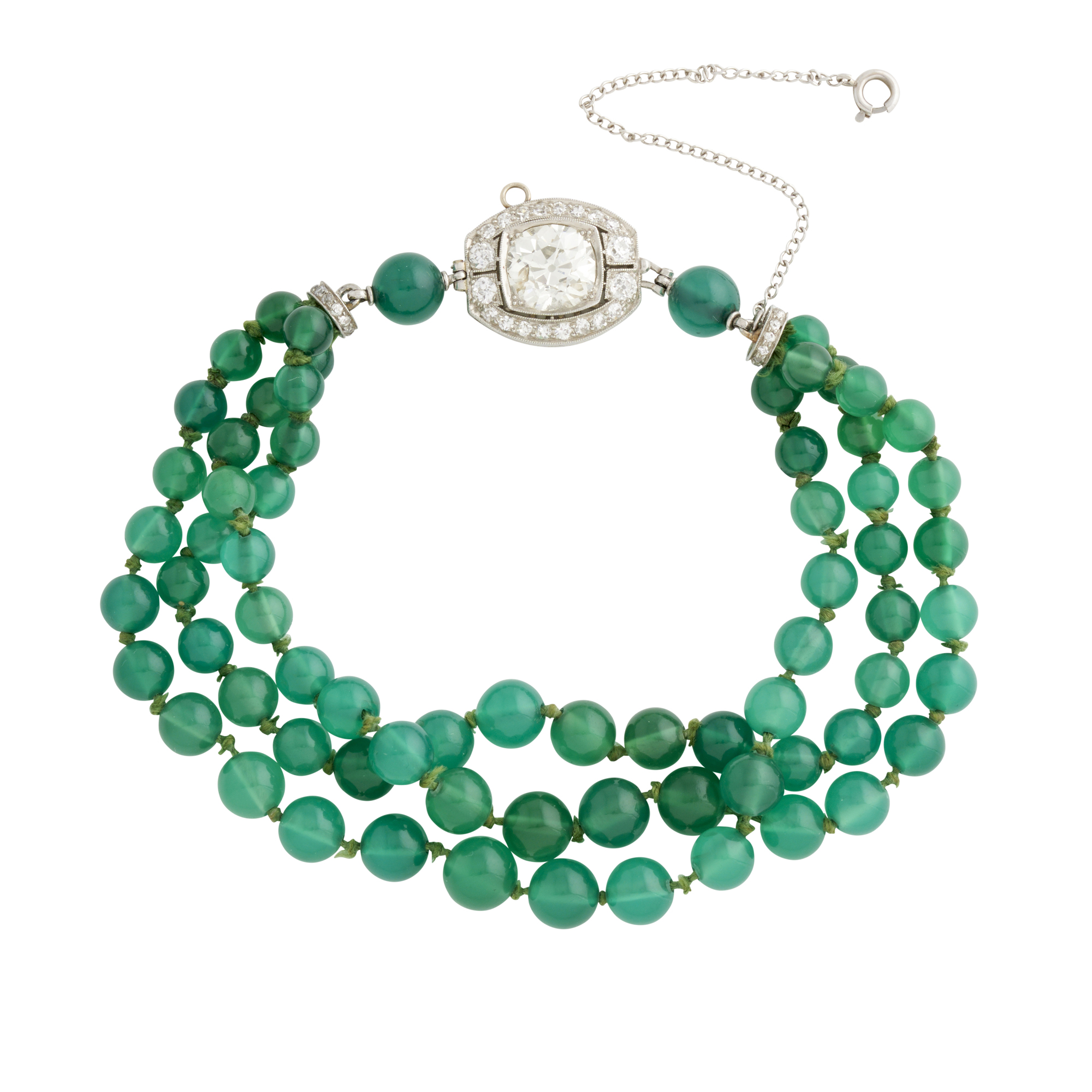 Comprising three strands of green hardstone beads, completed by a feature diamond cluster clasp, centring an old European-cut diamond weighing approximately 2.45 carats within a surround of further old European-cut diamonds together weighing approximately 0.30 carats, length 190mm, gross weight approximately 30.0 grams.