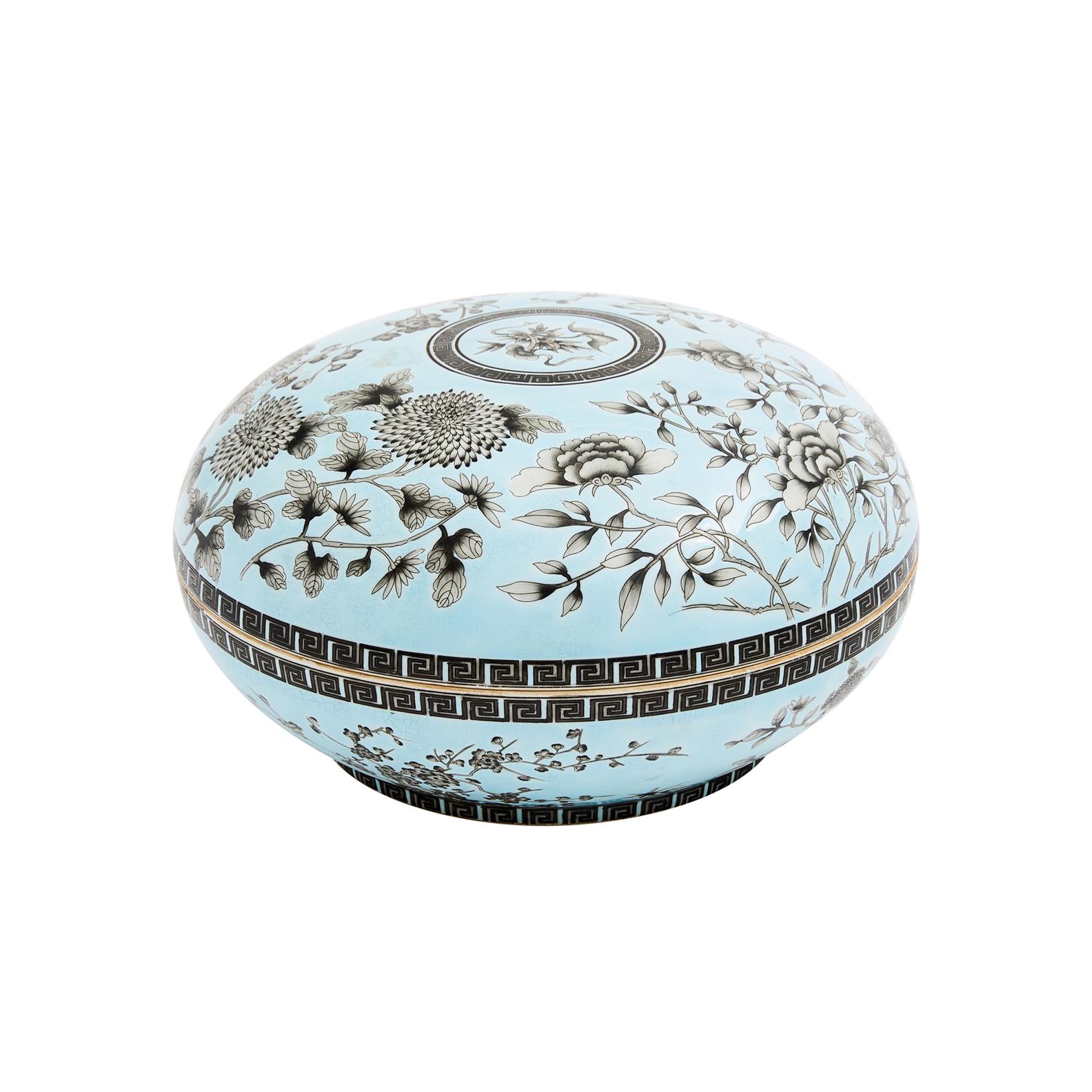 The turquoise ground decorated with the flowers of the four seasons en grisaille, the lid centred with a circular floral medallion within a greek key border, Tihedian mark to base.