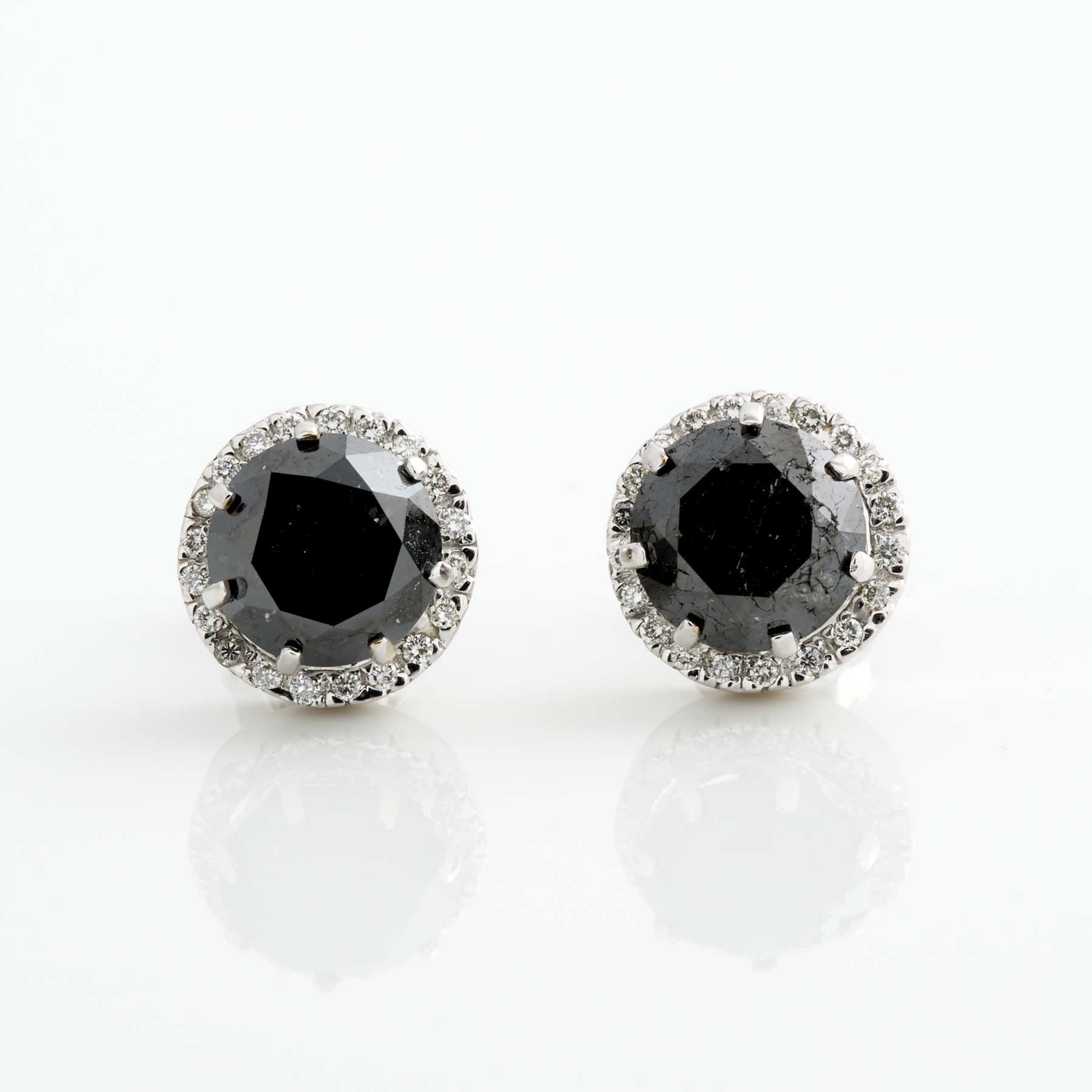 A PAIR OF BLACK DIAMOND EARRINGS IN 18CT WHITE GOLD, TO POST AND BUTTERFLY FITTINGS, THE DIAMONDS WEIGHING 5.02CTS, 4.82GMS