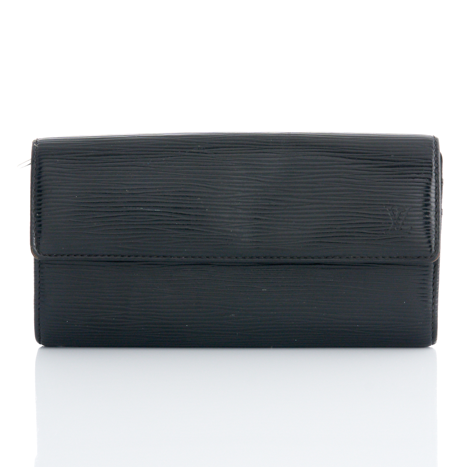 Styled in black Epi leather with silver tone hardware and press stud closure, measures 10 x 19 x 2 cm.