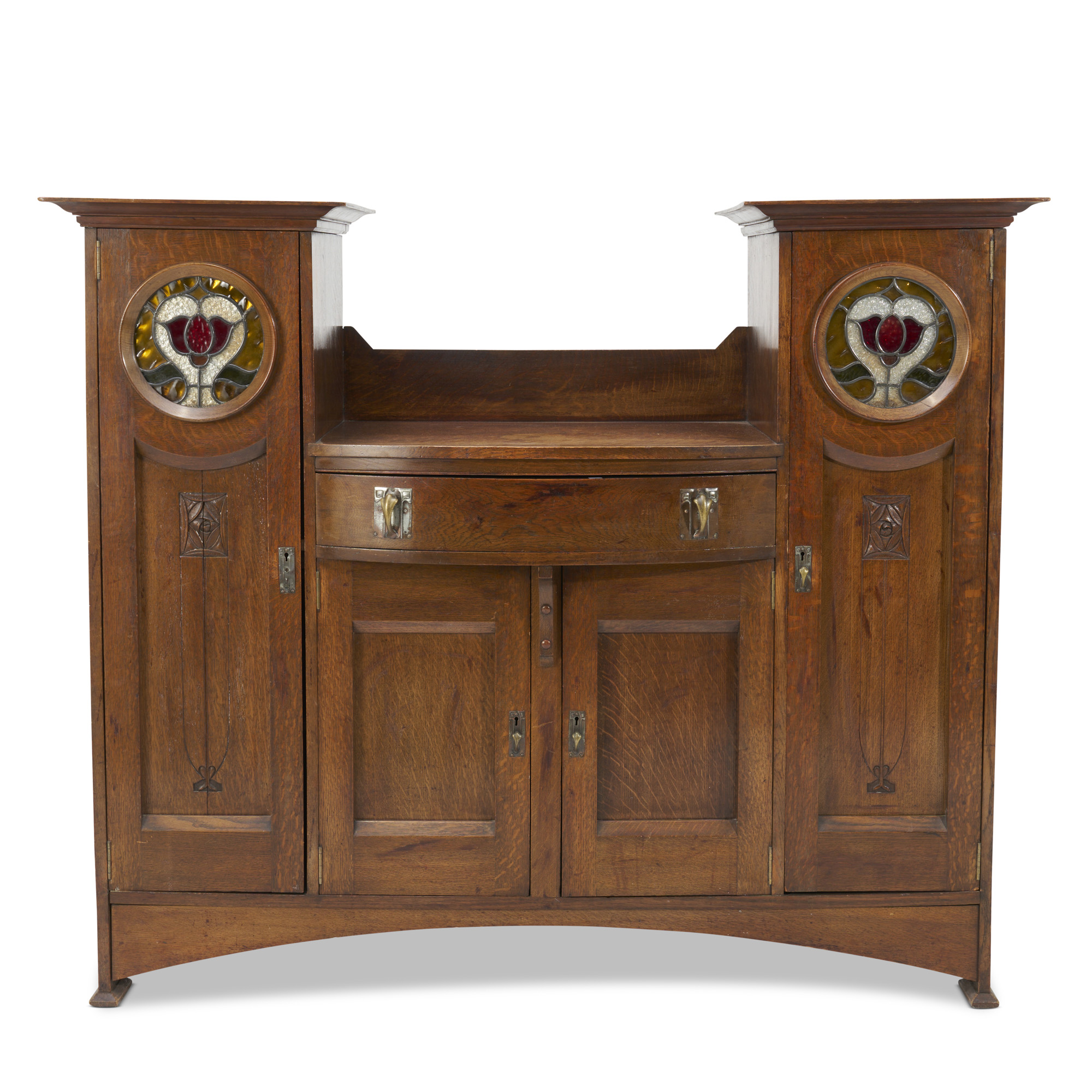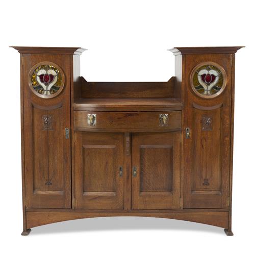 The bow-front centre of the top with a low back above a frieze drawer and pair of cupboard doors, all between a pair of tall cupboards, on moulded feet between shaped aprons, the tall cupboard doors with leaded stained glass roundels above incised stylised floral designs