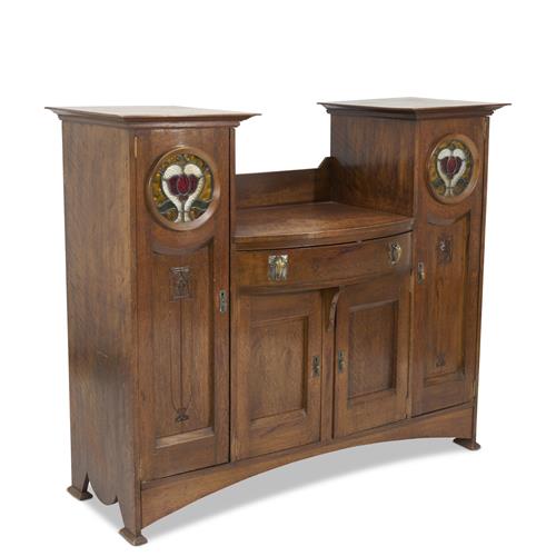 Two sideboards of this design but with variations in decorative details have been sold at auction in Britain in the past two decades (Lyon and Turnbull, Decorative Arts, Edinburgh, 14 November 2007, lot 274, in oak; and Anderson and Garland, Fine Art, Newcastle, 14 September 2017, lot 1233, in walnut). The first of these was described as 'Scottish' – presumably meaning the Glasgow School – and the second as being by Shapland & Petter but without any indication of the basis of that attribution.