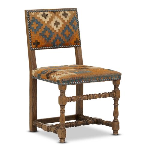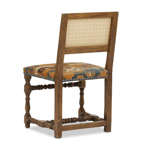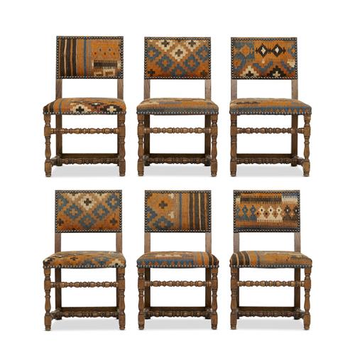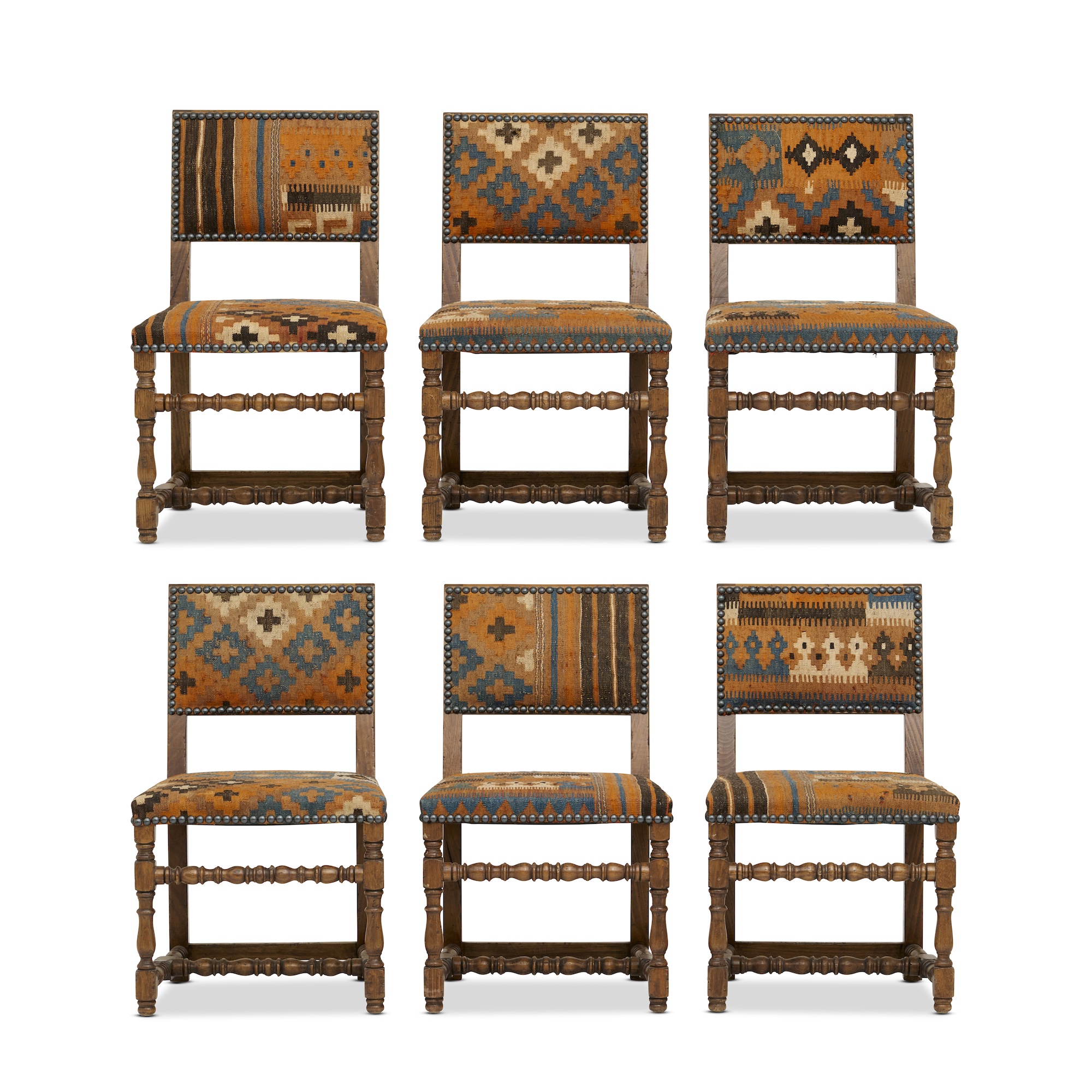 Of square 'backstool' form on turned supports and stretchers, the close-nailed padded backs and upholstered seats in antique kilim covers