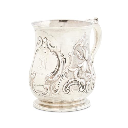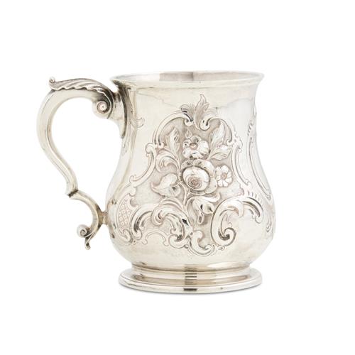 Of baluster shape with a leaf-capped scrolling handle on a circular foot, worked in relief to both sides with flowers and foliage and with a scroll-framed reserve opposite the handle later lightly engraved with initials JR and dates 1926–1951