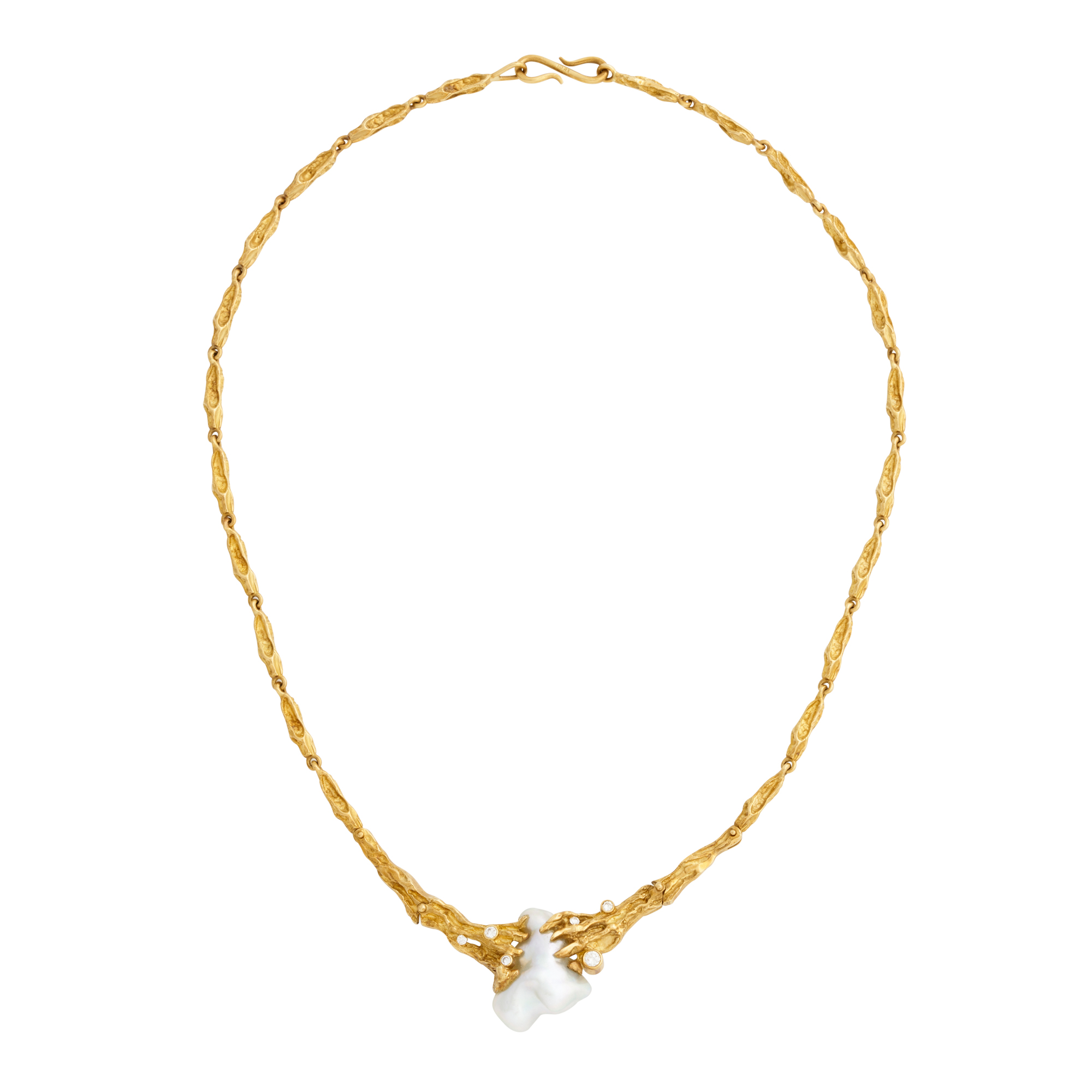 Centring a baroque pearl of silver hues measuring approximately 25.0mm by 19.0mm, to an integral fancy link chain detailed with six brilliant-cut diamonds together weighing approximately 0.25 carats, completed by a s-hook clasp,