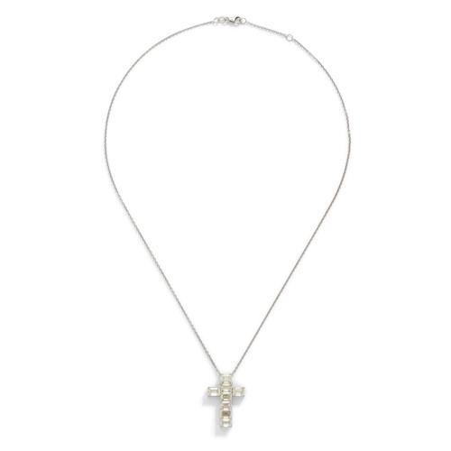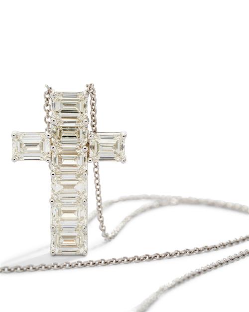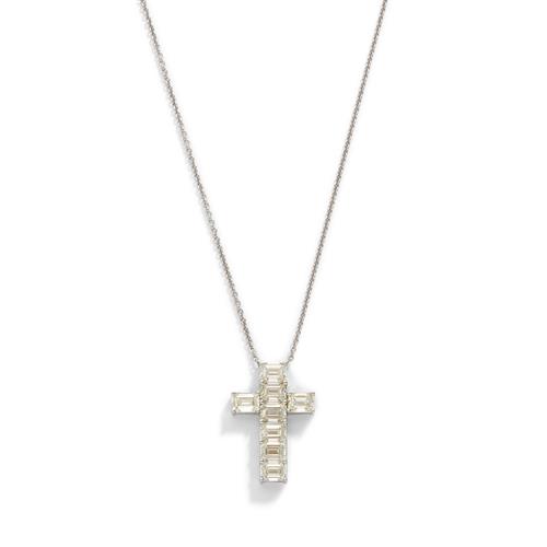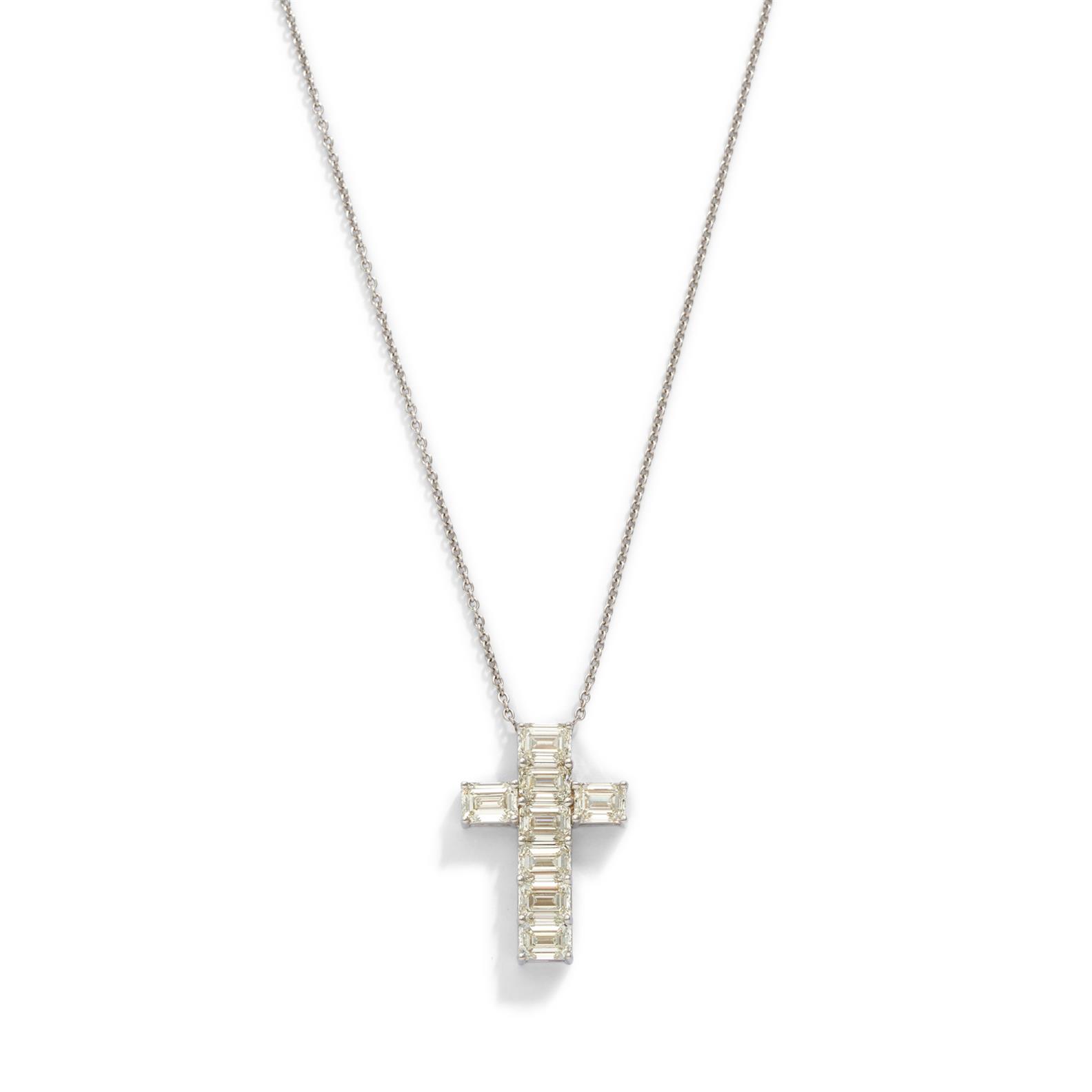 Designed as a Latin cross claw-set with 8 emerald-cut diamonds together weighing 5.64 carats, supported from a trace chain, mounted in 18ct white gold, pendant length 25mm, inner circumference 440mm (adjustable).