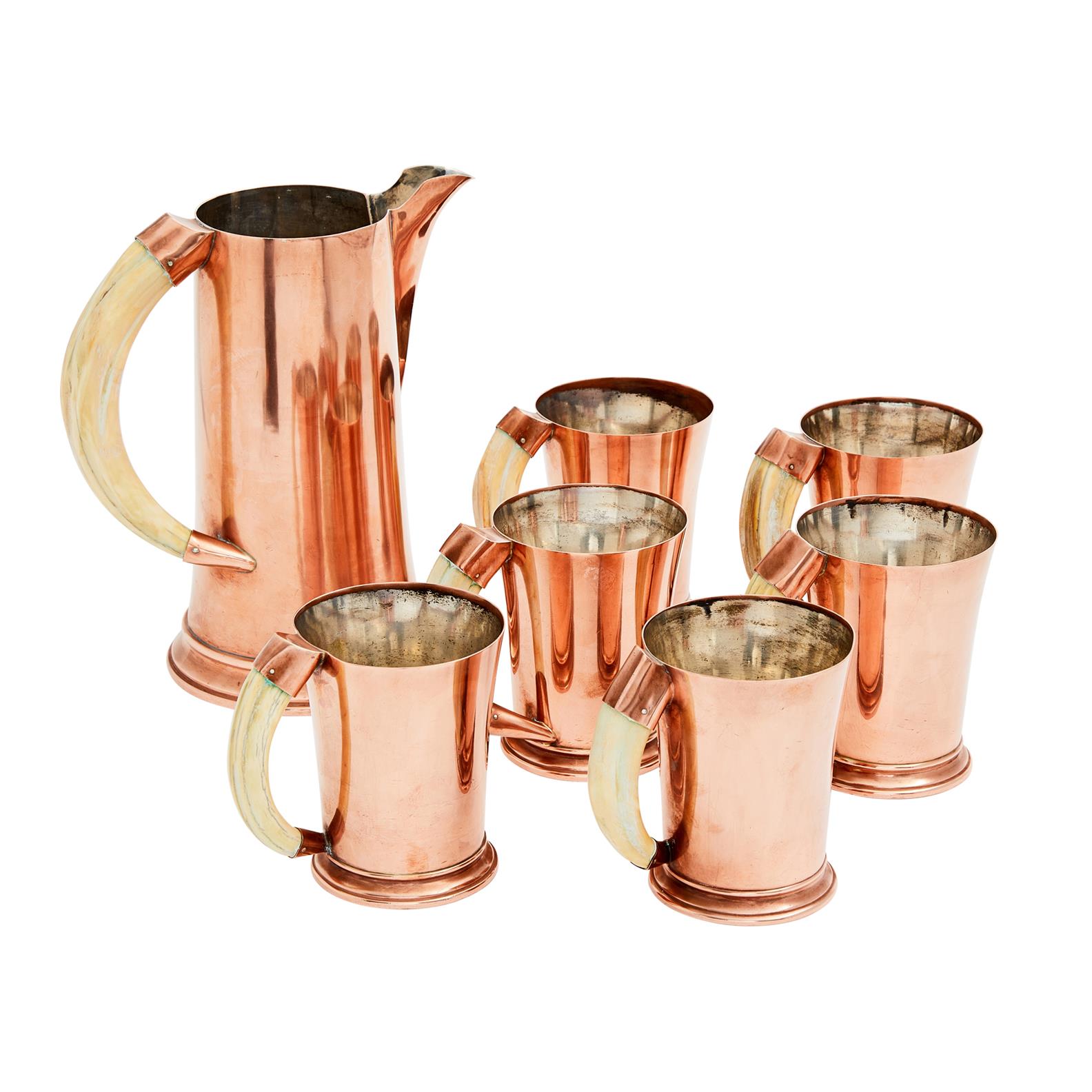 Acceptable wear, scratching, small dents consistent with age and use; wear to the silvered interior, some verdigris to underside of some mugs and consequent green staining to the horn handles.