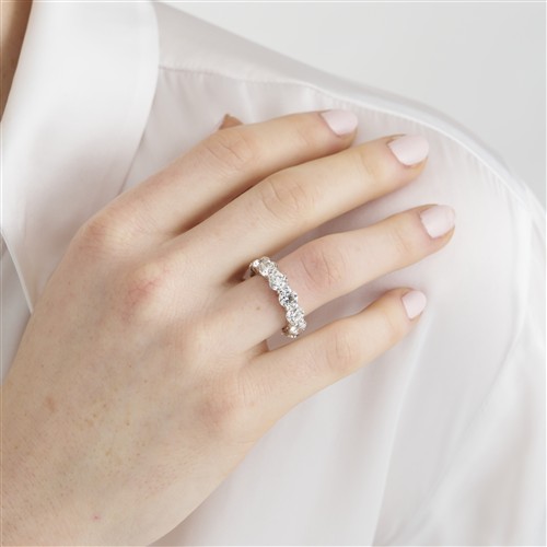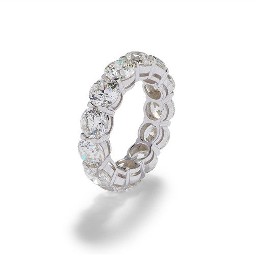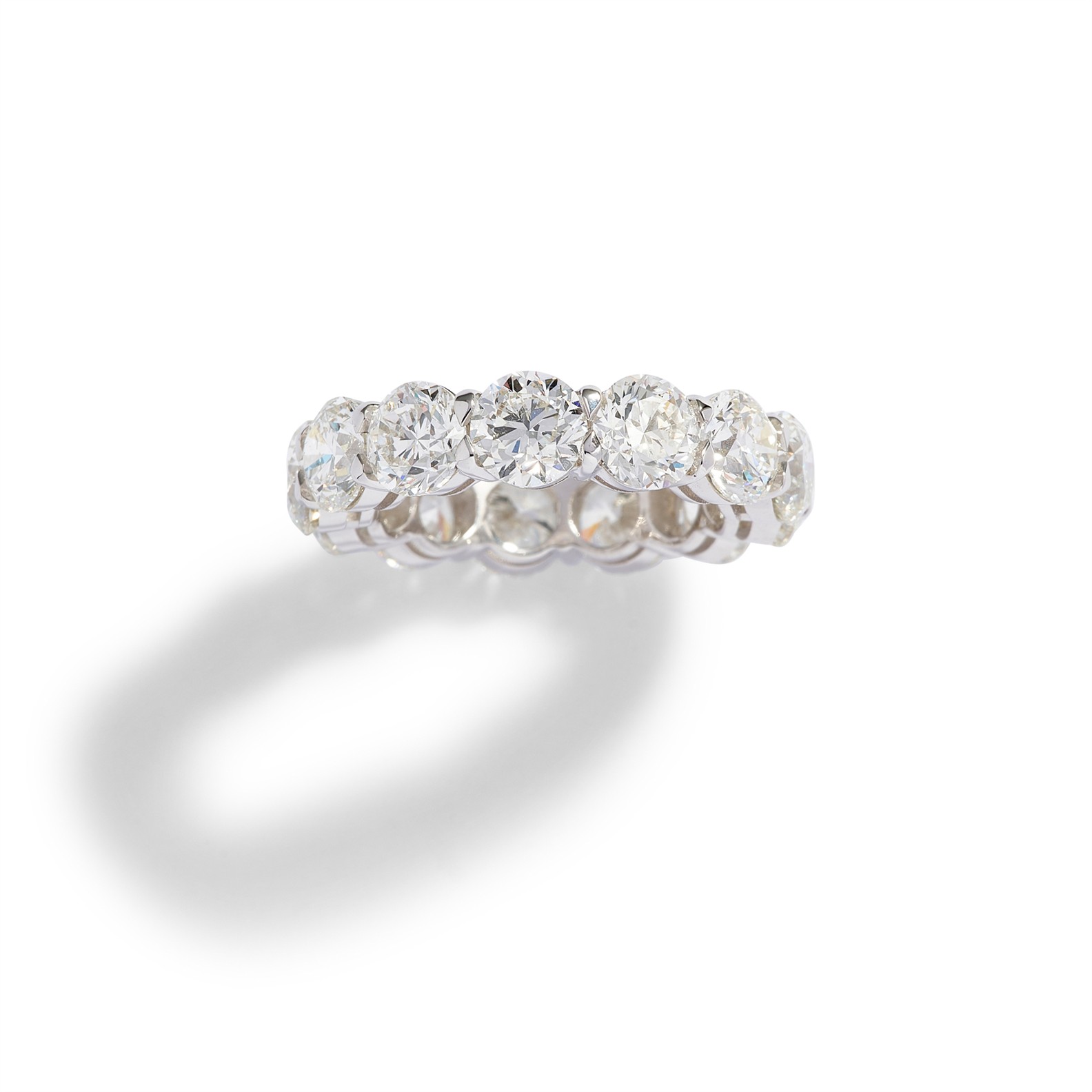 Designed as a continuous row of 13 claw-set round brilliant-cut diamonds together weighing 9.10 carats, mounted in 18ct white gold, size M.