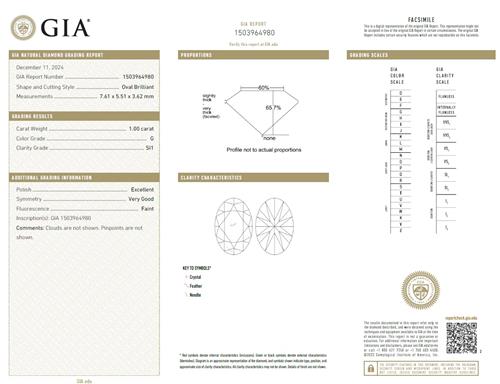 a GIA report numbered 1503964980, dated 11 December 2024, stating that the 1.00 carat diamond is natural, G colour, SI1 clarity, laser inscribed;