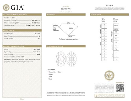 a GIA report numbered 6501661957, dated 16 October 2024, stating that the 1.00 carat diamond is natural, G colour, SI2 clarity, laser inscribed.