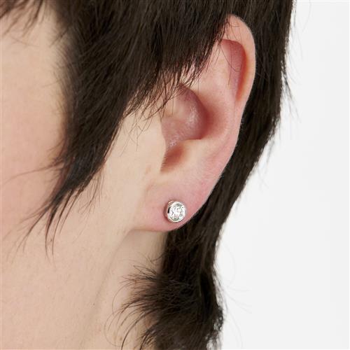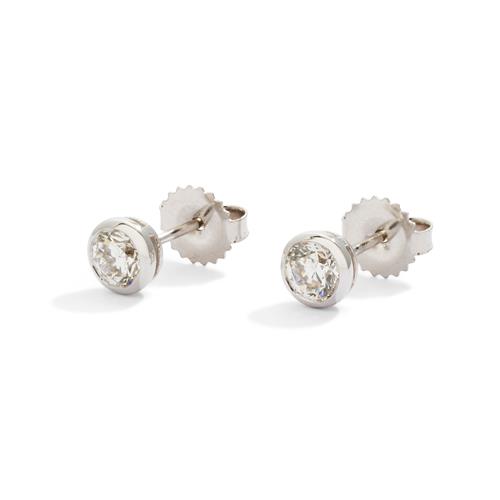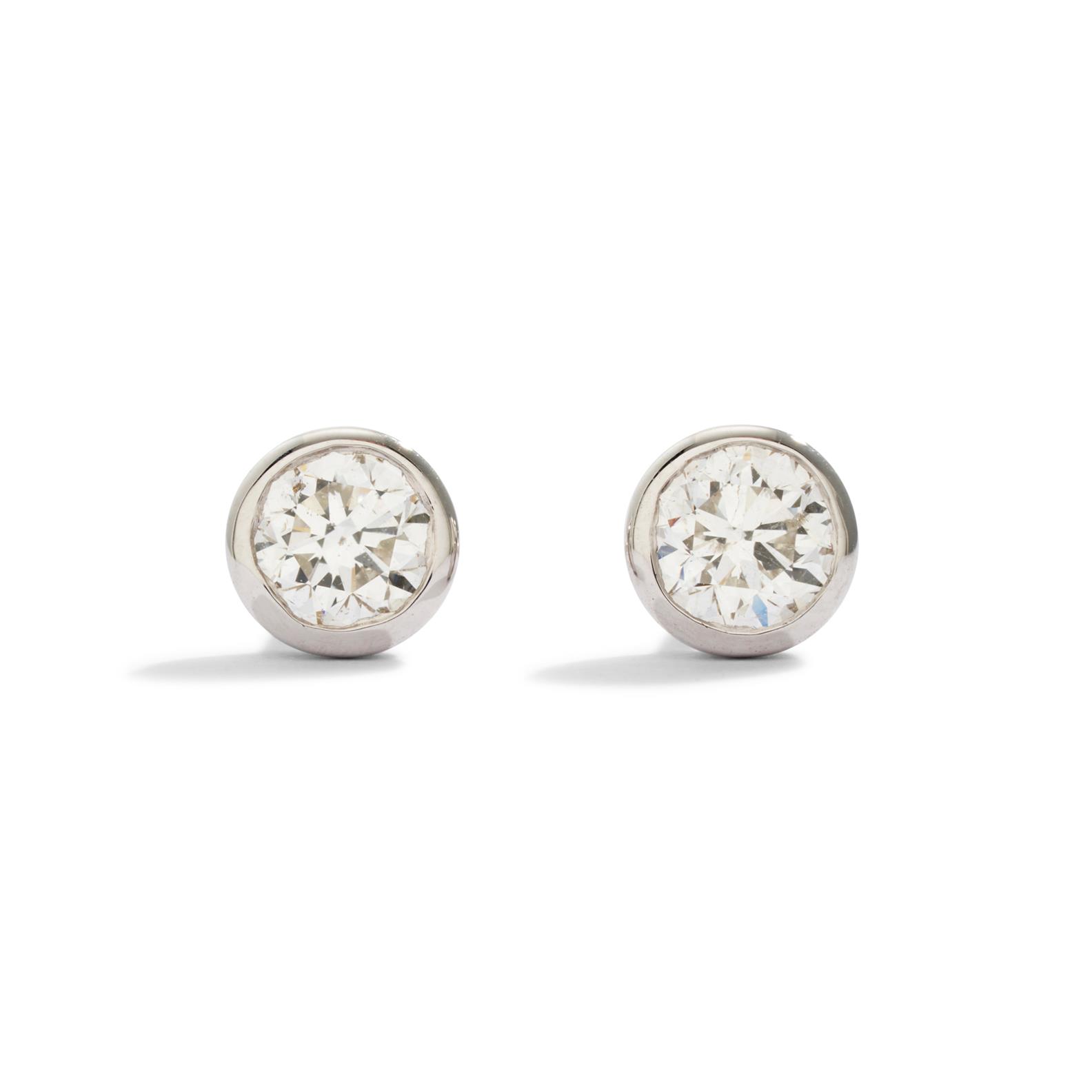 The round brilliant-cut diamonds together weighing a total of 1.00 carats, are bezel-set, mounted in 18ct white gold, post and scroll fittings.