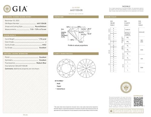 a GIA report numbered 6451100438, dated 3 November 2022, stating that the 1.70 carat diamond is natural, J colour, VVS2 clarity, laser inscribed;