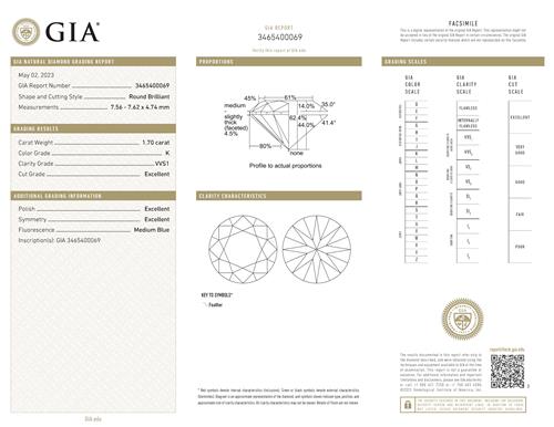 a GIA report numbered 3465400069, dated 2 May 2023, stating that the 1.70 carat diamond is natural, K colour, VVS1 clarity, laser inscribed.