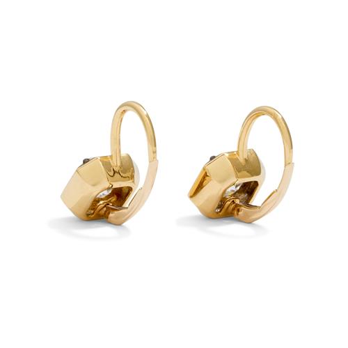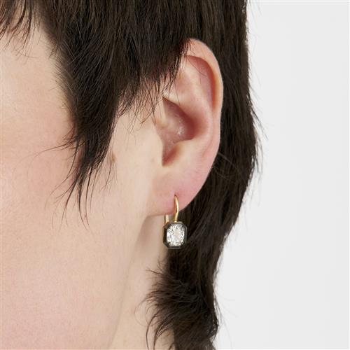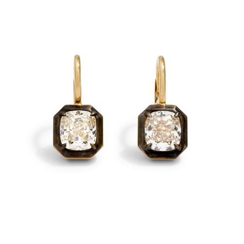 The cushion modified brilliant-cut diamonds together weighing 1.51 carats each, are claw-set in a sculptured surround, mounted in 18ct blackened gold, length 18.5mm, lever back fittings.