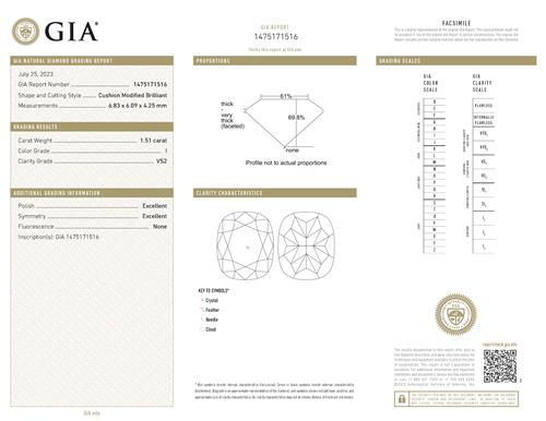 a GIA report numbered 1475171516, dated 25 July 2023, stating that the 1.51 carat diamond is natural, I colour, VS2 clarity, laser inscribed;