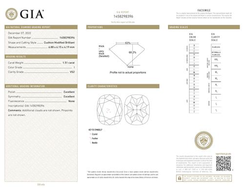 a GIA report numbered 1458298396, dated 7 December 2022, stating that the 1.51 carat diamond is natural, I colour, VS2 clarity, laser inscribed.