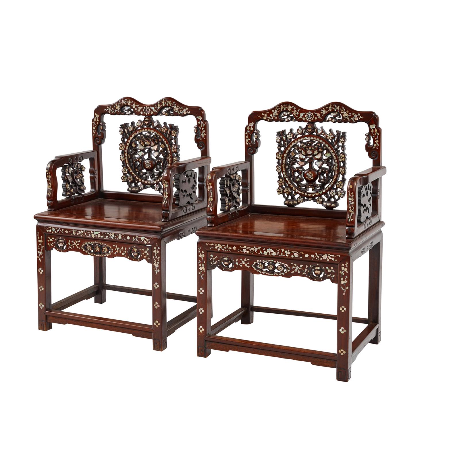 A PAIR OF CHINESE ROSEWOOD AND MOTHER OF PEARL INLAID ARMCHAIRS