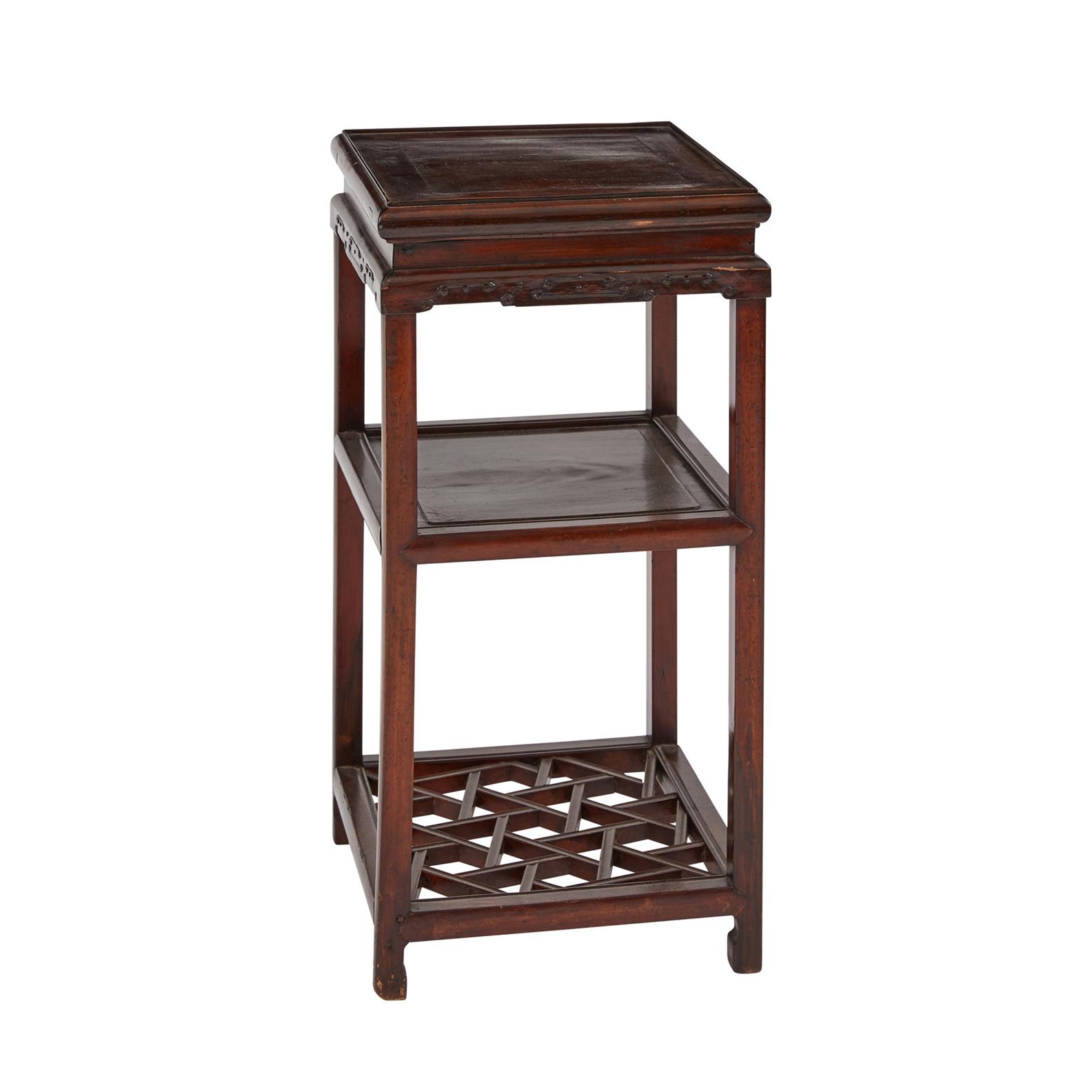 The moulded square top on waisted frieze with carved apron, above a panelled middle tier and a fretwork lower tier in the cracked ice pattern, on square sectioned supports.
