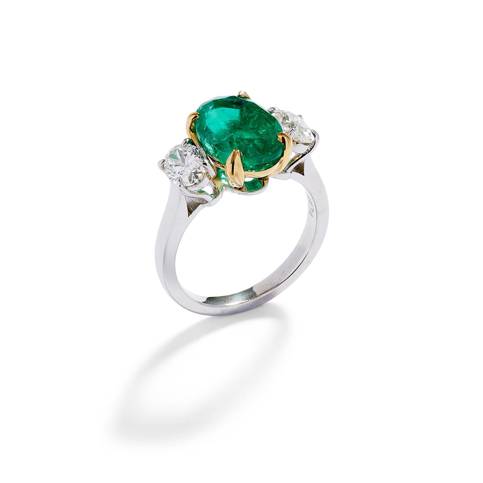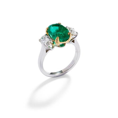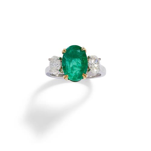 Centring a claw-set oval emerald weighing approximately 4.06 carats, flanked by a pair of similarly set oval brillant-cut diamonds together weighing 1.00 carat respectively, mounted in 18ct gold and platinum, size M.