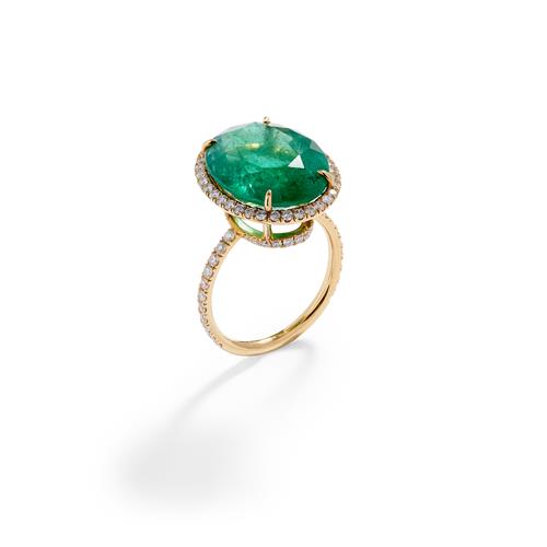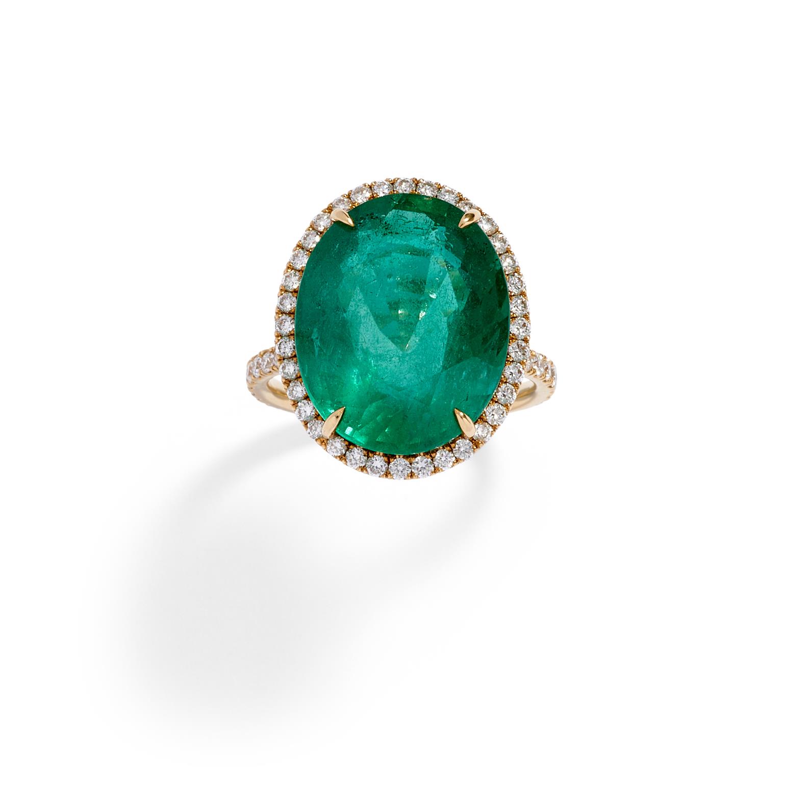 Of cluster design, centring a claw-set oval emerald weighing 10.68 carats, framed by a halo of round brilliant-cut diamonds, with the gallery and shank diamonds together weighing approximately 0.90 carats, mounted in 18ct gold, size L.