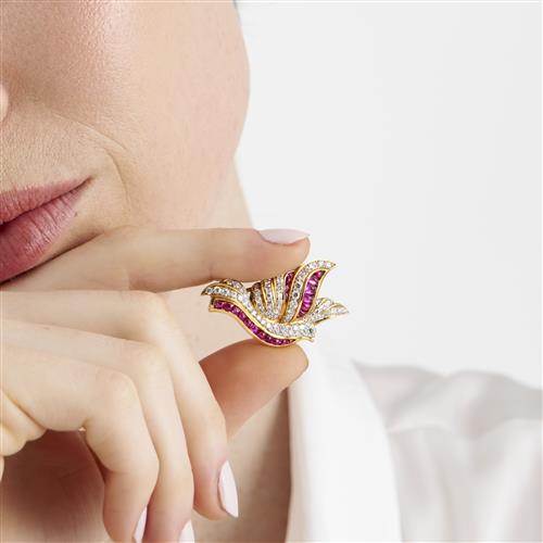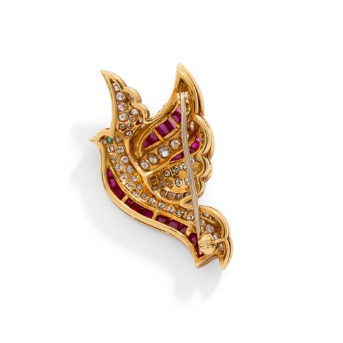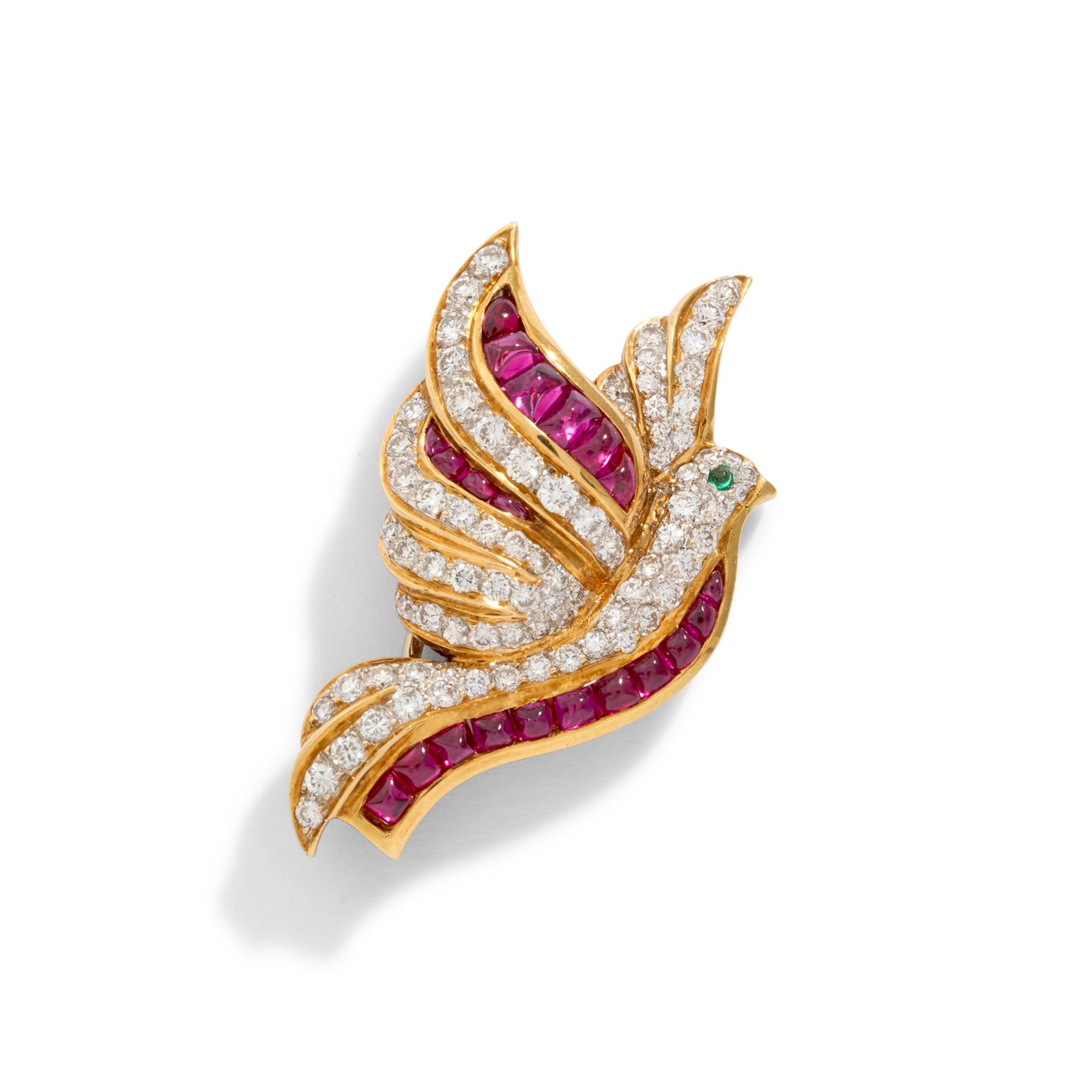 Designed as a stylised dove in flight, the eye bezel-set with a circular-cut emerald the body channel set with buff-top rubies between lines of pavé-set brilliant-cut diamonds, the rubies and diamonds together weighing 1.05 carats and 2.00 carats respectively, mounted in 18ct gold, length 41mm, width 21mm.